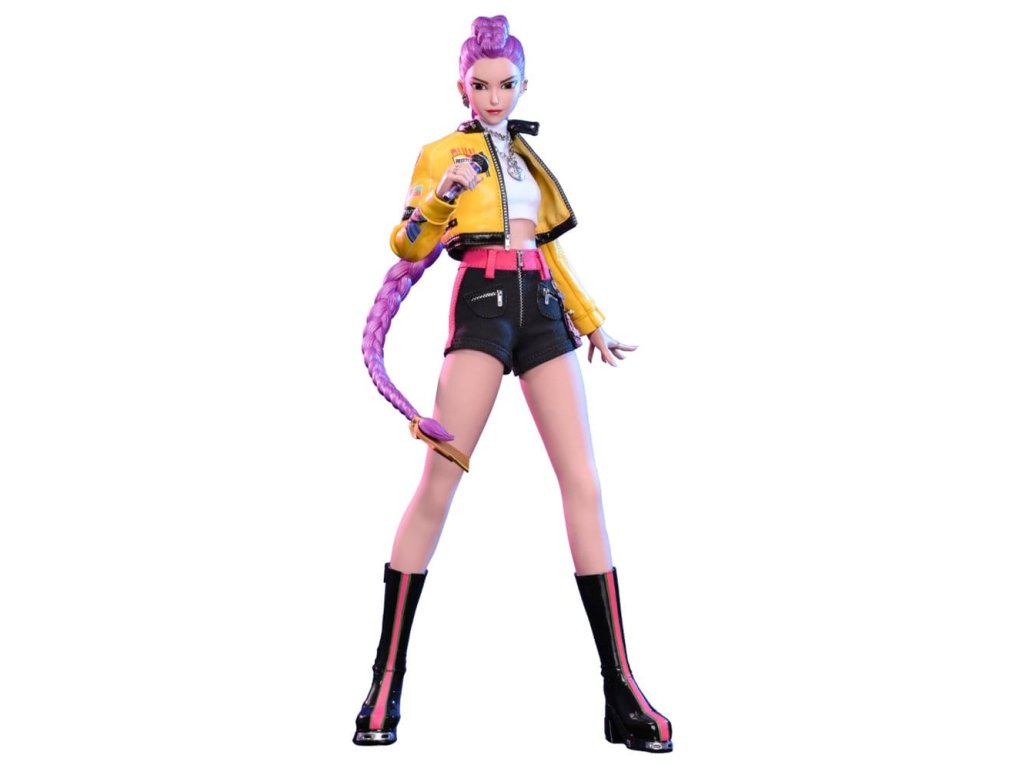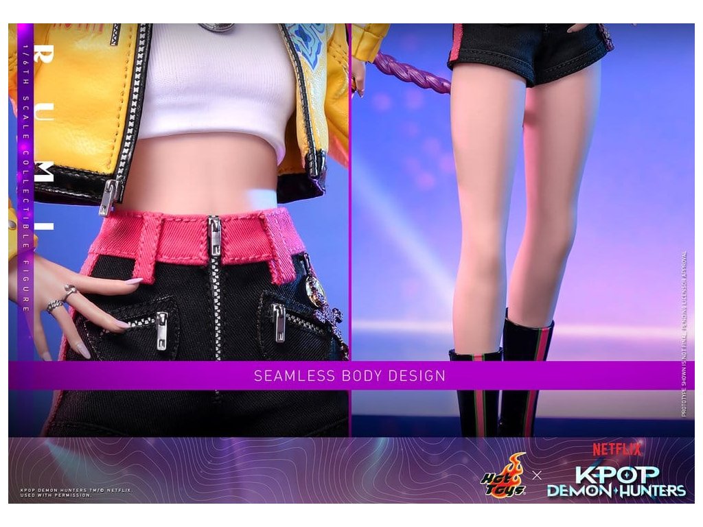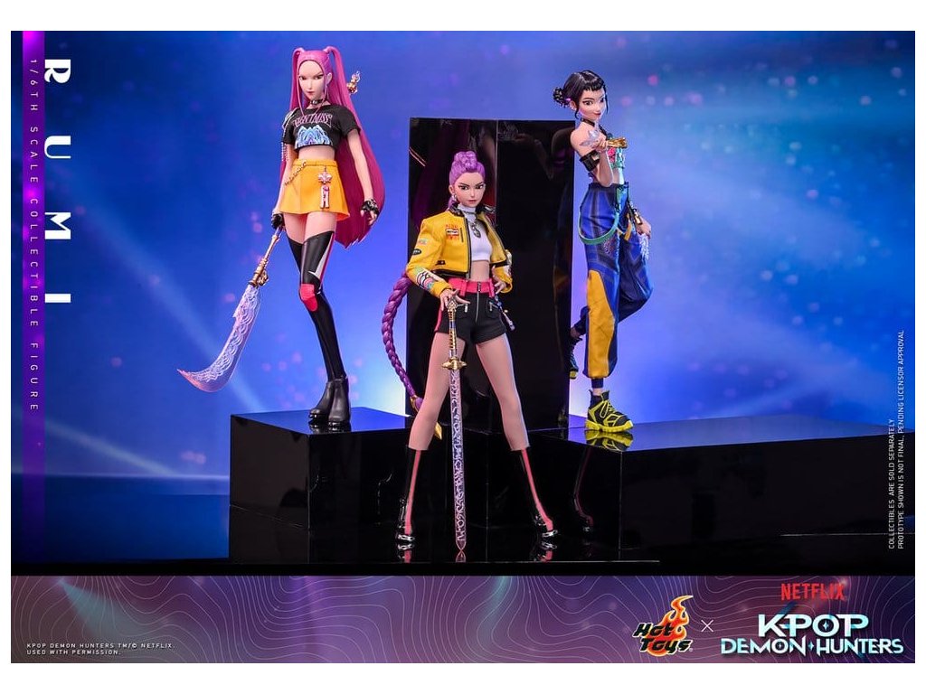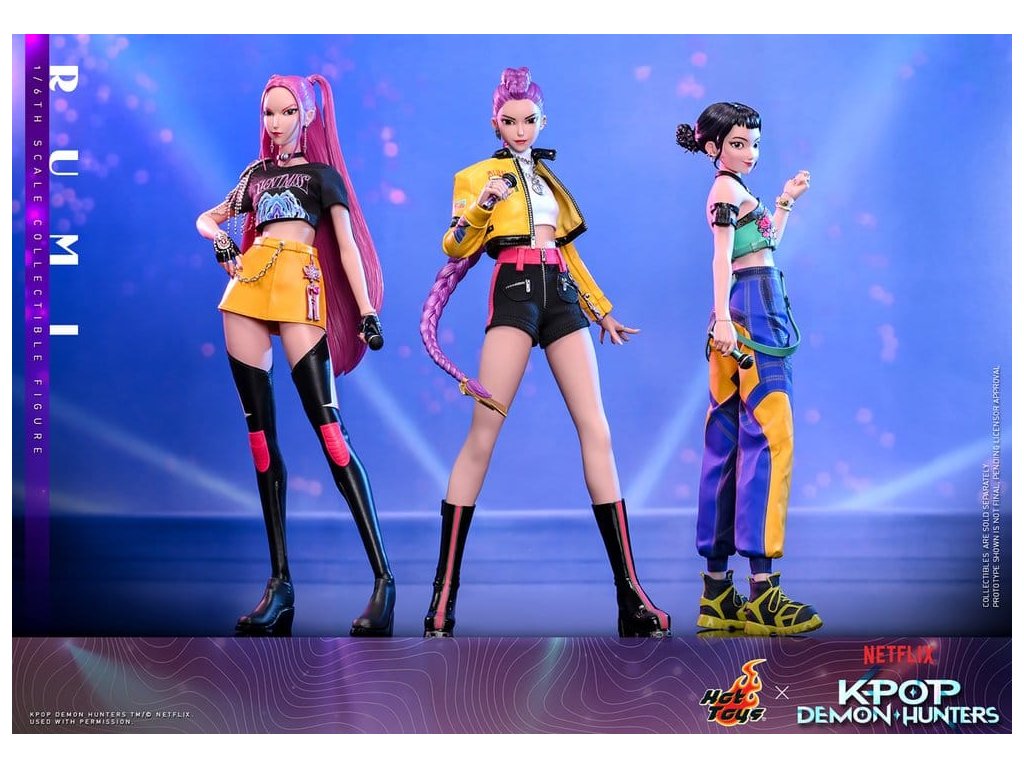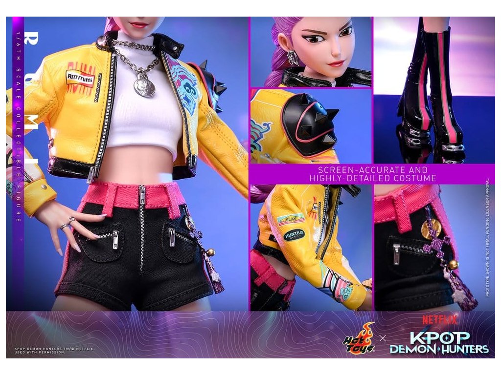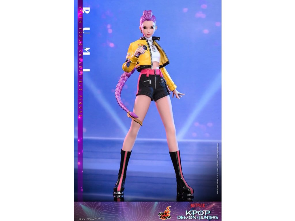 "Dobře, je čas na naše předzápasové ramyeon!" - Rumi. V KPop Demon Hunters je Rumi, charismatická lídryně a hlavní zpěvačka celosvětové senzace K-pop HUNTR/X, která ovládá scénu díky svému silnému hlasu a sebevědomé přítomnosti. Ohromuje fanoušky energickými výkony, zatímco tajně chrání lidstvo před démonickými silami, které hrozí, že rozbijí Honmoon. Sideshow a Hot Toys s hrdostí prezentuje sběratelskou figurku Rumi v šesté velikosti, která zachycuje její energii a ikonický styl v ohromujícím detailu. Figurka má nově vyvinutou hlavu se dvěma vyměnitelnými tvářemi (s úsměvem a zpěvem), obě vybavené oddělenými očima pro realistické zobrazení. Její typický účes s fialovými draky je zabudovaný, což umožňuje expresivní pozování, které odráží její pohyb na scéně. Tělo šesté figury je nově vyvinuté a je vyrobeno z silikonového materiálu pro dosažení bezšvého spojovacího designu. Osm kusů nově vyvinutých vyměnitelných rukou se sochařsky zpracovanými prstýnky a detaily na laku na nehty umožňuje širokou škálu expresivních gest, od póz představení až po bojové postoje. Rumi je připravena ve svém pečlivě vyrobeném oblečení pro její vystoupení "Jak se to dělá", které obsahuje odvážnou žlutou kraťasovou bundu s potiskem a ostnatou levou ramenní výplní, bílý rolák, kovové náhrdelníky, kraťasové kalhoty zdobené fialovým přívěskem norigae a párem lýtkových bot na platformě - zcela zachycuje její nápadnou estetiku na scéně. Když se hudba změní v boj, Rumi ovládá svůj Sain-geom (čtyřtigrý meč) - krásně vyrobenou zbraň s průhledným čepelí vyrytými souhvězdími a zlatou rukojetí, která symbolizuje jak tradici, tak moc. Úplný set příslušenství specifického pro postavu oživuje její svět, včetně mikrofonu, smartphonu, nádobky na nudle, funkčního světla HUNTR/X, holografického podpisu na plakátě, holografického praporu, lenticulárního pozadí postavy, a speciálně navrženého stojánku na figury s motivem scény pro dokončení výstavy. Rumi je divoká na scéně a nezastavitelná v bitvě, je tady s ostatními členy skupiny - předobjednávejte nyní a sejděte celou skupinu HUNTR/X ve svém výstavním prostoru! Orientační datum vydání: červen 2027