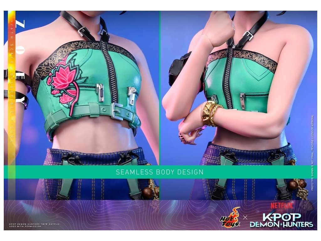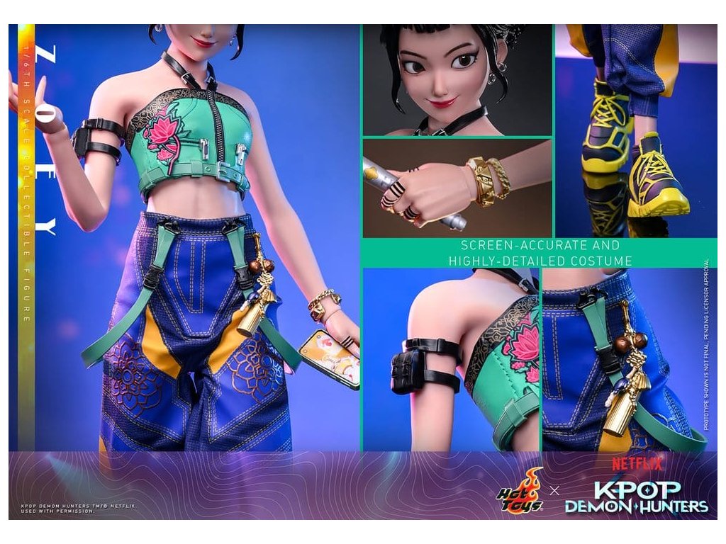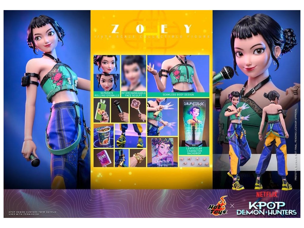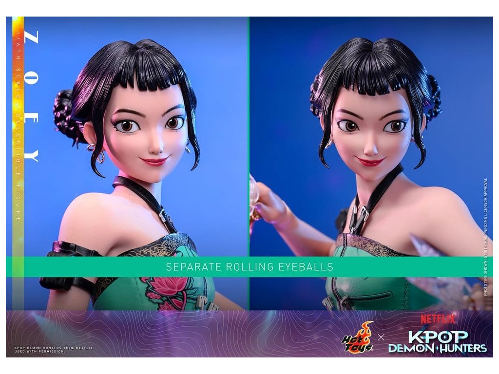 "Zrcadlo, zrcadlo na mém telefonu, kdo je nejšpatnější? My, ahoj?" - Zoey V KPop lovcích démonů je Zoey hlavní rapper a maknae HUNTR/X - živá, výrazná a nekonečně tvořivá. Svým hravým kouzlem rozsvěcuje scénu nakažlivou energií a bezchybným stylem. Pod její jasnou osobností leží dovedný lovec démonů, který pomáhá chránit Honmoon před silami, které se skrývají ve stínech. Sideshow a Hot Toys s hrdostí představují sběratelskou figurku Zoey v šesté velikosti, zachycující její živou postavu v dokonalém detailu. Akční figurka má nově vyvinutou hlavičku se dvěma vyměnitelnými tvářemi (úsmev a zpívající výraz) a samostatnými oči, které se otáčejí, doplněné jejími typickými černými copánky s mikro-ofinou. Tělo figurek šesté velikosti je vyrobeno ze silikonového materiálu, který nabízí bezproblémový design kloubů pro výrazné pózování. Součástí je osm kusů nově vyvinutých vyměnitelných rukou s vyřezávanými prstýnky a lakem na nehty, které sběratelům umožňují znovu vytvořit její nejikoničtější momenty na scéně i mimo ni. Zoey přichází s nově ušitým modelovým kostýmem "Jak se to dělá", včetně tyrkysového topu na krk spojeného se zlatým náramkem, náramkem a malým náramkem na ruku. Její kalhoty s vysokým pasem ukazují odvážné barvy se symetrickými vzory, akcentované zlatým norigae přívěskem. Look je dokončen párem robustních černých a žlutých tenisek, které dokonale odrážejí Zoein uličnický výkonný styl. Když se rytmus změní na rituál, Zoey používá své Shin-kal (duchovní čepele) - dvě sady krásně vyrobených zbraní s průhlednými čepelemi a zlatými stuhovými detaily, které zosobňují její plynulou bojovou techniku. Řada charakteristických doplňků připomíná momenty z filmu, včetně Zoeinho úžasného deníku, mikrofonu, chytrého telefonu, nudlového poháru, světelné tyče HUNTR/X, holografického podepsaného plakátu, lenticulárního charakteristického pozadí a speciálně navrženého stojanu na figurky s tématem stage. Energetická, výrazná a vždy nezapomenutelná Zoey se připojuje k sestavě zbytku týmu - předobjednejte si již teď a sežeňte si celou skupinu HUNTR/X pro svou sbírku! Orientační datum vydání: červen 2027