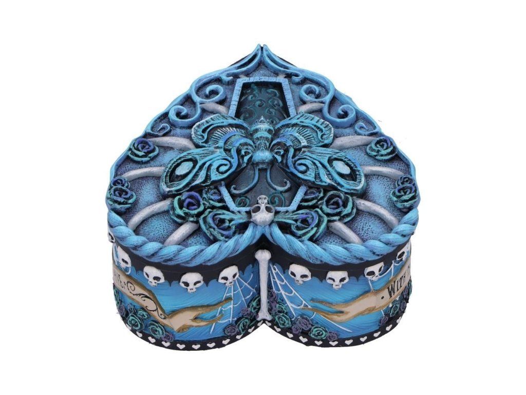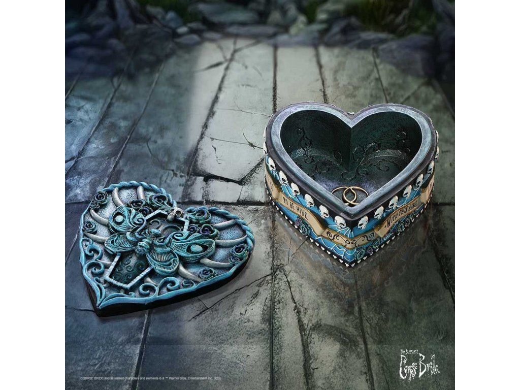 Krabičku na šperky v podobě srdce zdobí motivy z gotického a fascinujícího animáku Mrtvá nevěsta od Tima Burtona. Tato ručně malovaná šperkovnice se hodí pro ty nejcennější poklady i jako např. dárková krabička k Halloweenu. Krabička má odnímatelné víčko a bude vskutku originálním příbytkem pro tvé poklady!