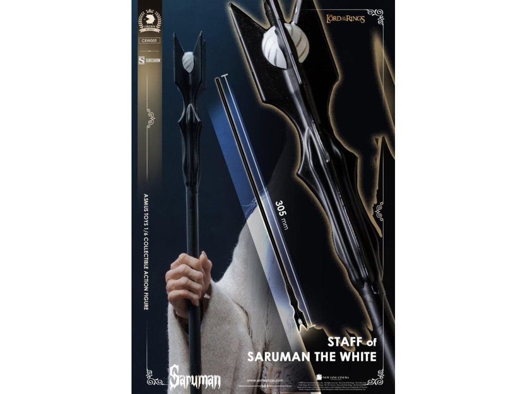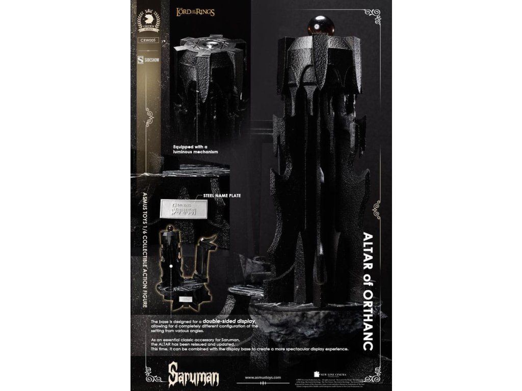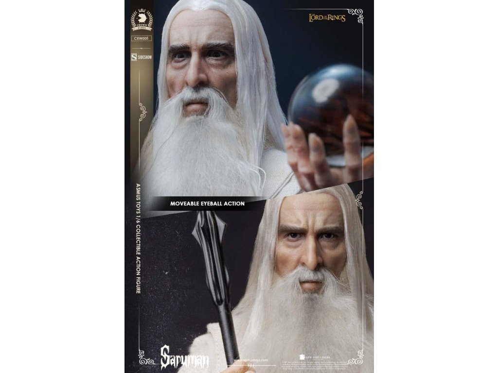 "Společně, můj Pane Saurone, budeme vládnout tomuto Středozemi." Výrobce Sideshow a Asmus Collectible Toys představují figurku Sarumana v měřítku šestkrát menší, inspirovanou jeho postavou z filmové trilogie Pán prstenů. Saruman Bílý je zrádný a mocný čaroděj, který se spojil s Sauronem v hledání Jednoho prstenu. Ze své komnaty ve věži Orthanc v Isengardu komunikuje Saruman s Temným pána přes palantír, zradí tak staré přátele jako Gandalfa Šedého ve své snaze zničit Společenstvo prstenu a otročit Středozem. Figurka Sarumana v měřítku šestkrát menší zachycuje jeho ikonický, královský vzhled tak, jak byl ztvárněn ve filmech - s mnoha body artikulace, vrstveným látkovým oblečením a doplňky pro rekonstruování jeho nejvýznamnějších scén. Sarumanův stařecký portrét má pohyblivé oči a syntetické vlasy na hlavě a obličeji. Figurka pro sběratele je dodávána se čtyřmi páry rukou - ruce sevřené, uvolněné ruce, otevřené ruce a ruce s vykřiveným gestem -, které lze vyměňovat pro vytváření dynamických póz a interakce s jeho doplňky, včetně jeho hůlky moci a jeho palantírové koule. Dvojstranná základna pro vystavení inspirovaná Orthancem obsahuje samostatně vystavitelný oltář s luminiscenční funkcí, která se páruje s průhlednou koulí pro zlověstný efekt. Fanoušci Tolkiena mohou svou figurku postavit do mnoha různých pozic pro tohoto mocného kouzelníka a intrikána.Nová síla se zvedá ve vaší sbírce. Přineste si dnes domů figurku Sarumana v měřítku šestkrát menší pro svoji sbírku Pán prstenů.