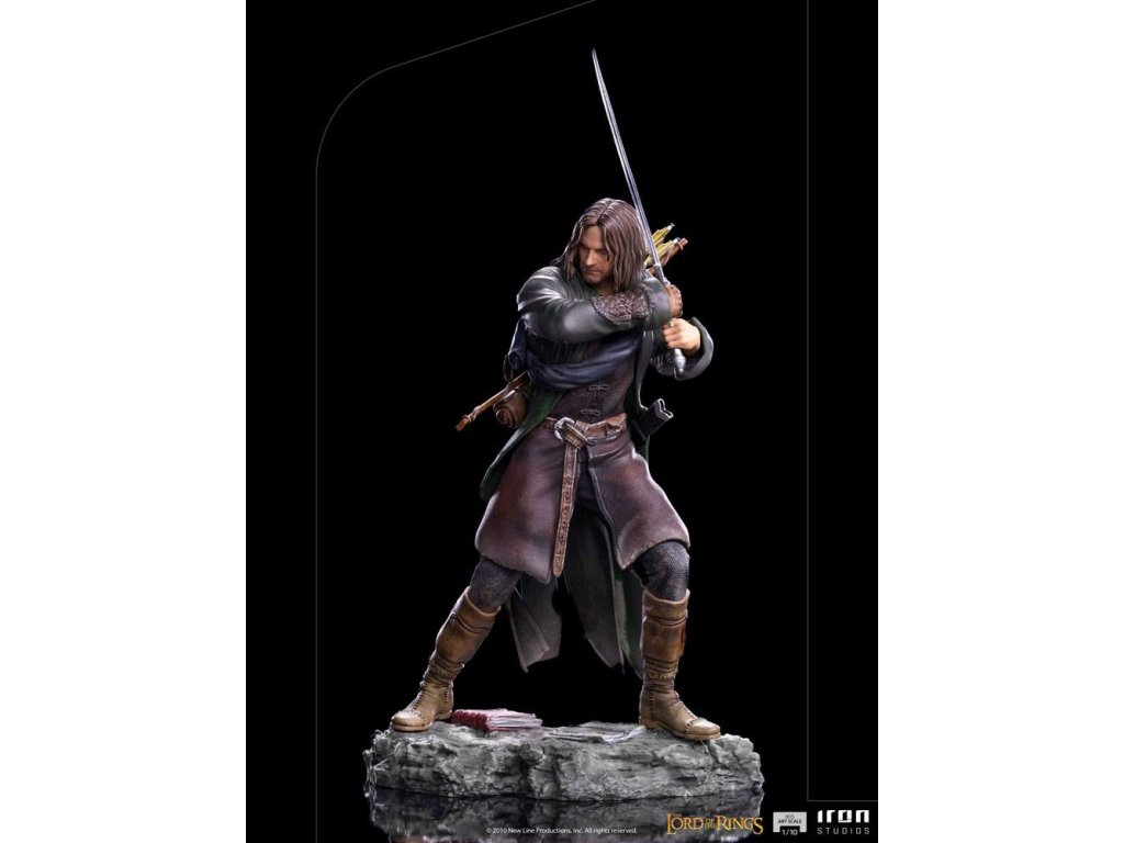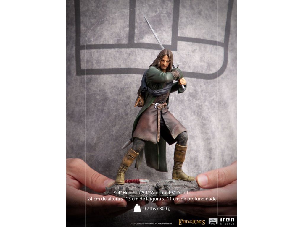 S napůl otevřenýma očima a pevně svírající svůj meč se strážce severu připravuje čelit útoku legie skřetů na svou skupinu spojenců uvězněných v Balinově hrobce. Věrný i těm nejmenším detailům svého oblečení, rysů a podoby dánského herce Viga Mortensena představuje Iron Studios svou sochu vznešeného 'Aragorna - BDS - Pán prstenů - Art Scale 1/10', kde neohrožený hrdina stojí na základně představující zkamenělou půdu Minas Moria, s prastarými knihami a zápisníky, s historickými záznamy o rasě trpasličích bojovníků, padlých u jeho nohou. Tato socha je součástí diorámy znázorňující tuto ikonickou bitvu z filmu 'Pán prstenů: Společenstvo prstenu', adaptovaného pro film Peterem Jacksonem v roce 2001. Jeden z protagonistů literárního díla Pán prstenů, které vytvořil britský profesor a filolog J. R. R. Tolkien, Aragorn byl lesní strážce a proslulý bojovník, který skrýval svou pravou identitu jako dědic Isildura, krále Gondoru, pod přezdívkou Strider. Byl členem takzvaného Společenstva prstenu s posláním zničit Jeden prsten a porazit Temného pána Saurona, v Minas Morii čelil útoku skřetů společně s ostatními členy Společenstva prstenu. Aragorn vedl armády lidí v bitvě proti Sauronovi a byl později korunován jako král Elessar Telcontar, 26. král Arnoru a 35. král Gondoru, první vysoký král Gondoru a Arnoru od krátké vlády Isildura. Vyroběno z polystone (může obsahovat části z pryskyřice, kameniny, PVC, kovu a tkaniny). Rozměry: 24 x 13 x 11 cm.