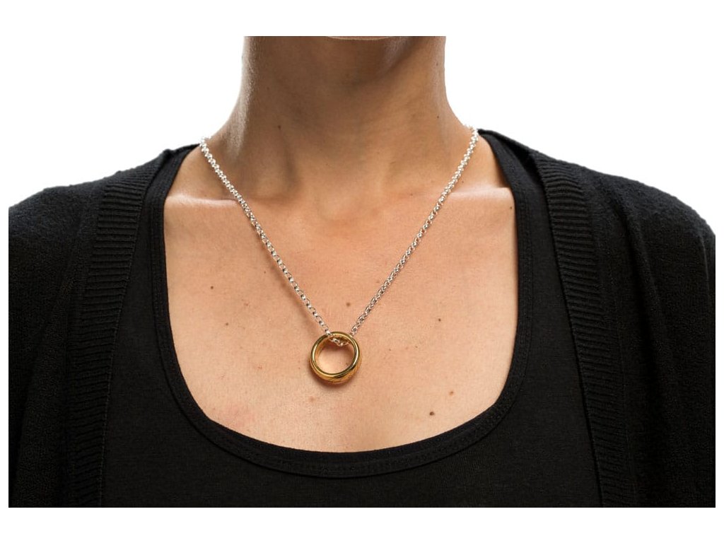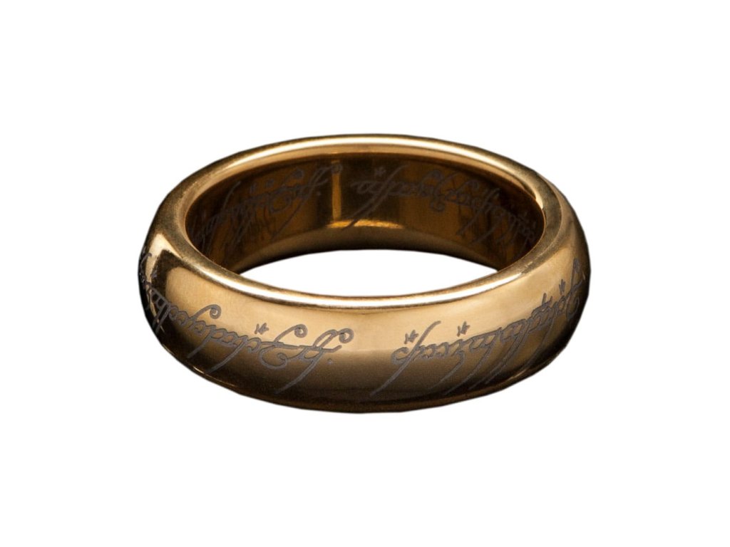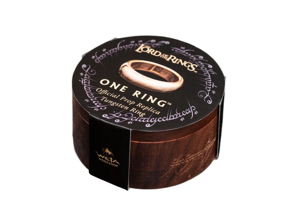 Společnost Weta se s potěšením spojila s Jens Hansenem, aby vyrobila Jeden Prsten z pozlaceného karbidu tungstenu. Je vyroben přesně podle tvaru, tloušťky a proporcí původního filmového rekvizity. Pozlacení 18K a výrazná hmotnost tungstenu nyní zaručují, že můžete vlastnit Jeden Prsten, který vypadá a cítí se naprosto správně. Tento nádherný šperk má na vnitřní i vnější straně prstenu, stejně jako na krásné dřevěné dárkové krabičce vyrobené z přírodního ořechového dřeva, jemně vyrytá starobylá elfská písmena. Krabičku lze díky důmyslnému a téměř neviditelnému pružnému pantu vystavovat otevřenou nebo zavřenou silným magnetem vzácné země. Víko má na vnější straně logo Pána prstenů a na vnitřní straně loga Weta a Jens Hansen. Spodní vnitřní část krabice je potažena modrým sametem. Jako vše, co je vyrobeno z přírodního dřeva, se vyskytnou variace ve struktuře a barvě a barva může také časem změnit. Tento jev je zcela přirozený.