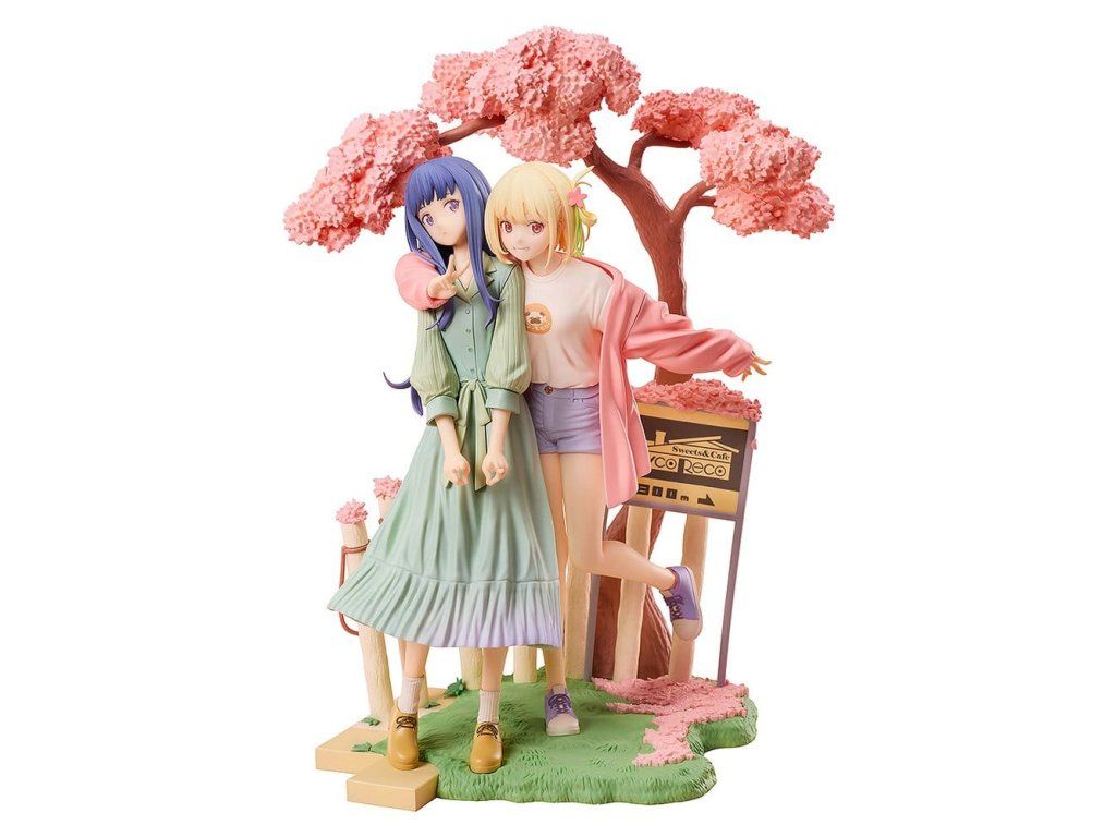Představujeme figurku založenou na obálkové ilustraci z vydání TV anime "Lycoris Recoil" na Blu-ray a DVD! Figurku roztomile zachycuje Chisato, jak si šťastně klade ruku kolem Takiny, zatímco zdrženlivá Takina dělá znak V. Na podstavci figurky jsou věrně zobrazeny symbolické prvky ilustrace, jako strom sakury a cedule. Díky jarní atmosféře je to figurka, kterou lze obdivovat ze všech úhlů.
