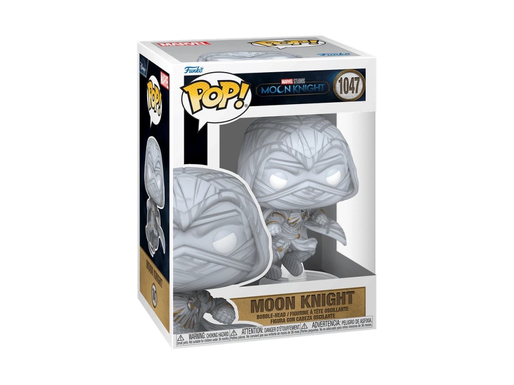 Stylová přibližně 9 cm vysoká vinylová sběratelská figurka Moon Knight inspirovaná seriálem Moon Knight z edice Funko POP! Marvel.