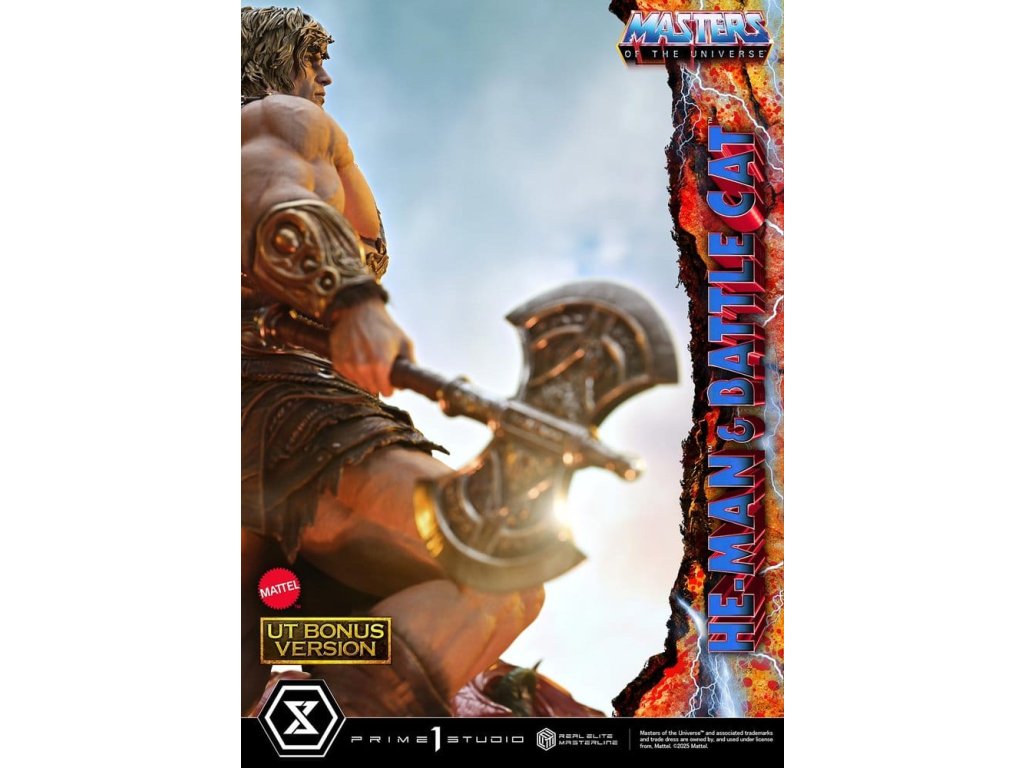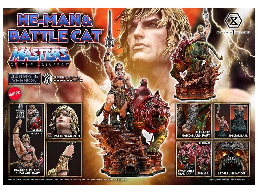„Mocou Grayskullu! MÁM MOC!“ Nejmocnější muž vesmíru a jeho spojenec - realistické ve velikosti 1/4. Série se odehrává na planetě Eternia, kde „Pánové vesmíru“ vyprávějí nekonečný příběh bitvy dobra a zla. Z této velkolepé ságy, která pokračuje již od roku 1982, se nyní k řadě Real Elite Masterline připojují He-Man & Battle Cat.Během své dlouhé historie měl He-Man tělo a výstroj v mnoha různých formách. Pro tuto sochu jsme zvolili tradiční vzhled, na který si každý vzpomene, když se zmíní tento hrdina. K tomuto ikonickému stylu jsme přidali esenci z každé éry, zachytili jsme „tradici v evoluci“ ve velikosti 1/4, spolu se svým společníkem, Battle Catem. Jeho divoké vlasy a působivý portrét, spolu s jemně tvarovaným tělem, které personifikuje „nejmocnějšího muže vesmíru“, spojují realistické detaily se subtilní stylizací. Obrovský meč Power, jeho bojový postroj a ramenní brnění a plátěné spodky s kožešinovými detaily jsou všechny vyrobeny s bohatými, hmatatelnými povrchy.Battle Catovo hojné kožešině dodává mnohovrstevnatý efekt světla a stínu, což vyvolává pocit života v jeho impozantním těle. Detailně vyryté brnění, oči a zuby naplněné bojovým duchem – to vše navozuje příběh o jeho silné přítomnosti.Těžká, speciálně navržená základna je inspirována Hradem Grayskull. Uvnitř LED světlo rozsvítí oči přední brány a bublající lávu níže, což evokuje skrytou, převažující moc, která se uvnitř nachází.Tělo He-Mana s vysoko vzhůru zvednutým Power Swordem. Zavřená puště Battle Cata, která vytváří silné, výmluvné ticho. Užijte si kombinaci těchto prvků se stojanem na bustu, který si můžete přizpůsobit podle toho, jak si chcete sošku zobrazit.Kromě toho Ultimate Bonus Verze zahrnuje extra pravou ruku držící bojovou sekeru. Matný lesk na jejích obou čepelech oživuje rané umělecké práce He-Mana.He-Man a Battle Cat, oživení realistickými barvami a tvary – přidejte Nejmocnější Pouto Vesmíru do své sbírky.- Základna s tématikou Pánové vesmíru s LED osvětlením.Způsob napájení LED: TBD* Prosíme, připravte si baterie, USB kabely nebo jiné potřebné položky v závislosti na konečné metodě napájení. Orientační datum vydání: září 2027