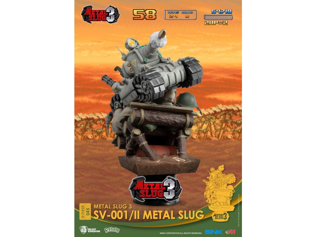 'Heavy Machine Gun', nesmrtelná fráze z jedné z nejznámějších videoher s horizontálním scrollováním! Na co si vzpomenete, když uslyšíte tu klasickou větu? Na spršku střel, hrdiny, kteří potřebují záchranu, obrovské tanky? Pravděpodobně na to všechno a ještě více! Série Metal Slug nikdy nezklame a 'Entertainment Experience Brand' od Beast Kingdom je připravena zavést vás znovu do světa vzpomínek s vydáním nejnovějšího diorámy D-Stage! Kolekce 'staging your dreams' je zpět s dobře známou scénou z Metal Slug 3, oblíbené hry ze série SNK! Připravte se na akci s tankem SV-001/II Metal Slug, který může vypadat kulatě, ale dává silný úder. Rekonstruovaný v 360 stupňové slávě, SV-001/II Metal Slug je zachycen během lezení po vážně neklidně vypadajícím dřevěném mostě a střílení svým slavným kanónem! Dioráma prezentuje detailní doteky, jako je kanónový kouř, bojové poškození a prchající střely! D-Stage SV-001/II Metal Slug je jeden ze signaturních bitevních tanků SNK, roztomilý, ale smrtící stroj, který si zaslouží svoje místo na stole u vás. Objednejte si svůj u oficiálního prodejce Beast Kingdom ještě dnes!