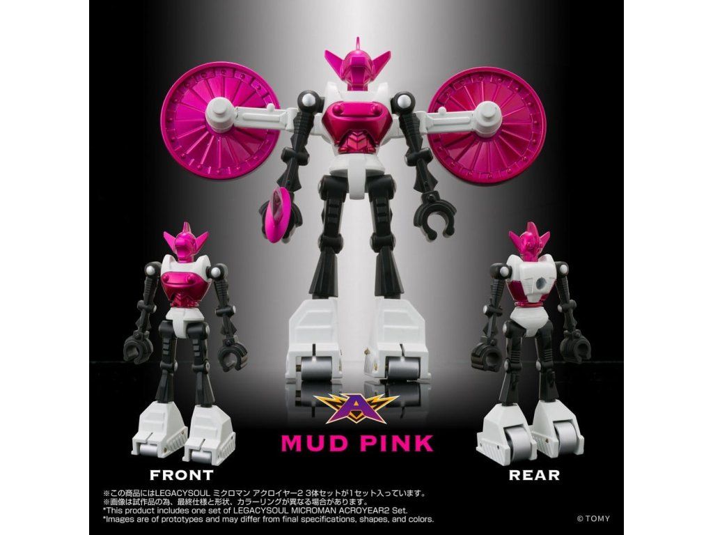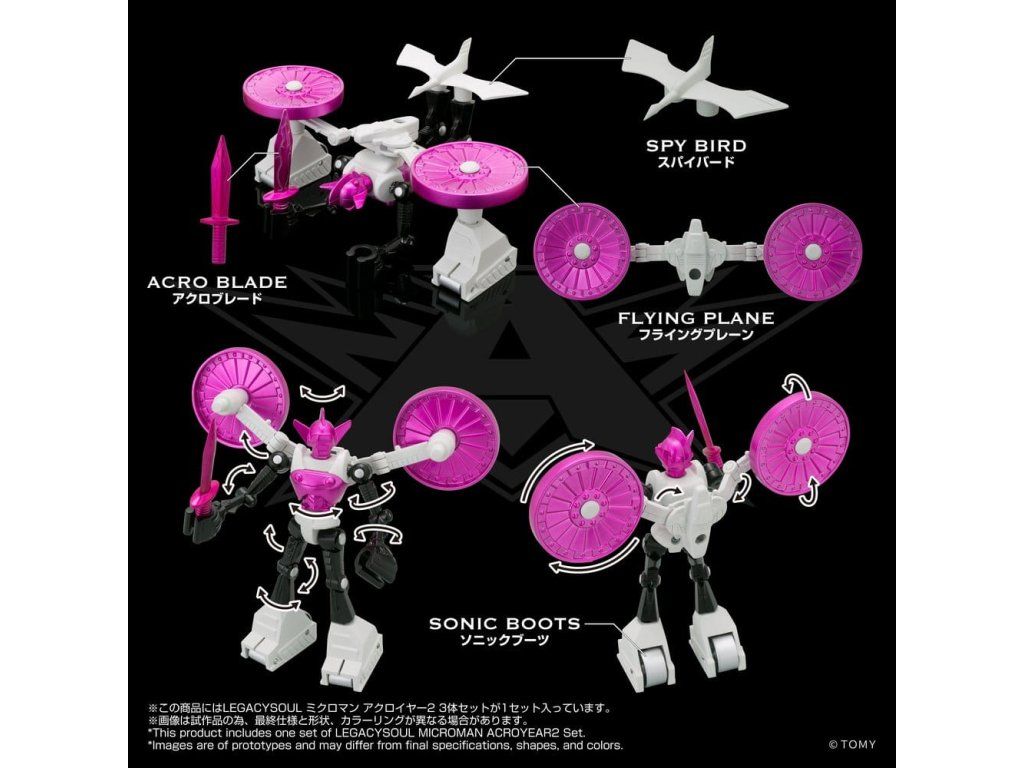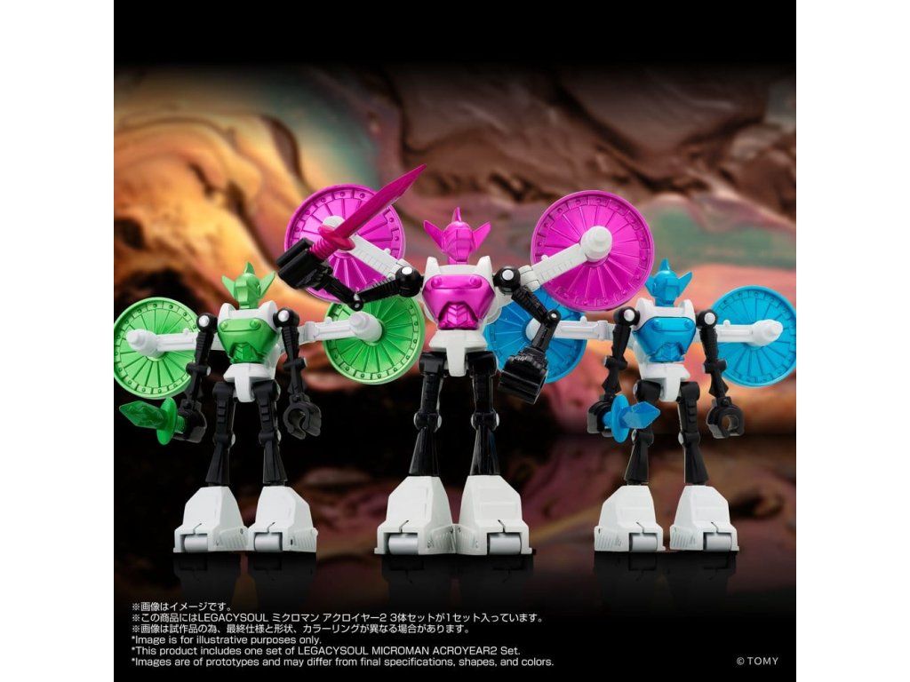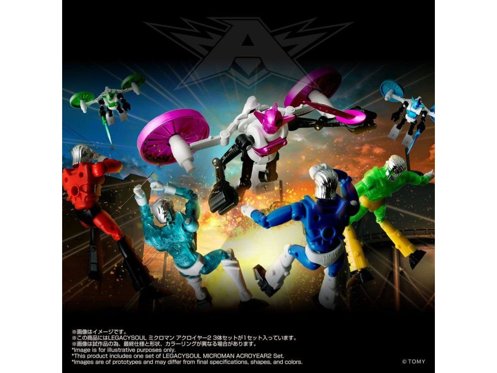 Řada Legacysoul je moderní pojetí těchto výrobků, vylepšené o nové mechanismy. Produkty, které zůstaly v paměti uživatelů, jsou posunuty s využitím nejnovějších technologií. Prodávají se v Japonsku i v zahraničí; v Japonsku jsou však dostupné výhradně přes vlastní e-shop společnosti. Akční figurka: Legacysoul Microman Acroyear 2. Svět Microman, který vás fascinoval v dětství, ožívá. V souladu s dobovým designem byla figurka aktualizována současnými technologiemi — nejen co do vzhledu a proporcí, ale také s rozšířenou pohyblivostí na 20 artikulačních bodů. Sada obsahuje tři figurky: Acroyear 2 A311L Mad růžová, Acroyear 2 A312L Mad zelená a Acroyear 2 A313L Mad modrá. Obsah balení: - 1 x Acroyear 2 A311L Mad růžová - 1 x létající letadlo pro A311L Mad růžová - 1 x Acro Blade pro A311L Mad růžová - 1 x Acroyear 2 A312L Mad zelená - 1 x létající letadlo pro A312L Mad zelená - 1 x Acro Blade pro A312L Mad zelená - 1 x Acroyear 2 A313L Mad modrá - 1 x létající letadlo pro A313L Mad modrá - 1 x Acro Blade pro A313L Mad modrá - 3 x špionážní pták