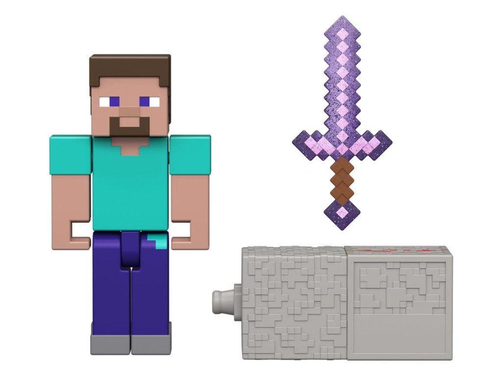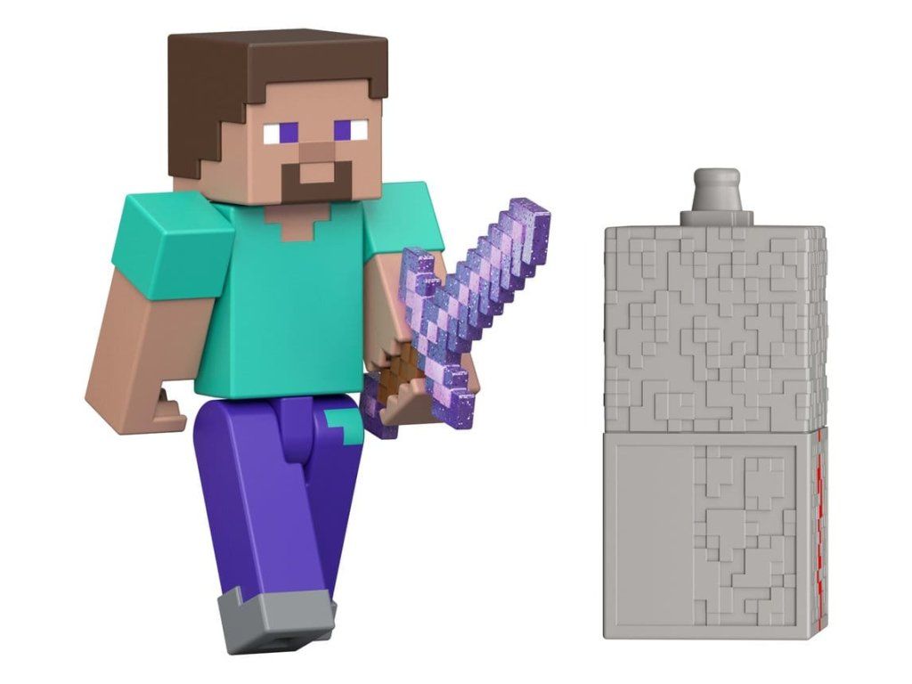 Toto je akční figurka postavy Steve z Minecraftu. Jedná se o oficiálně licencovaný produkt od společnosti Mattel.