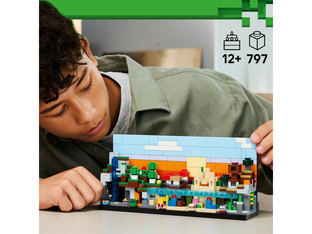 Vzdejte hold biomům ze světa Minecraft® se stavebnicí LEGO® Minecraft® (21589) Mini biomy pro holky a kluky od 12 let. Milovníci Minecraftu ukážou světu svou lásku k videohrám díky modelu s 5 biotopy a 5 mikro figurkami: Stevem, Creeperem, krávomůrkou, Huskem a plenitelem. Tato stavebnice LEGO Minecraft obsahuje 5 odnímatelných biomů: hory s krápníkovou jeskyní, ametystovou geodou a vodopádem, květinový les s jeskyní, lávou a zlatem, houbové pole s korálovým útesem, vrakem lodi, 2 červenými houbovými stromy a hnědou houbou, poušť s chrámem, korálovým útesem, oceánem, kaktusy a truhlou s pokladem a savanu se základnou plenitelů, bujnou jeskyní, akáciovými stromy, dýní, lávou a pláží. Součástí je také také oboustranné pozadí (den/noc). Tato stavebnice představuje skvělý videoherní dárek pro hráče Minecraftu a fanoušky LEGO. A děti můžou stavět s jistotou díky aplikaci LEGO Builder – přibližujte a otáčejte model ve 3D a sledujte postup pomocí srozumitelného digitálního návodu. Stavebnice obsahuje 797 dílků.