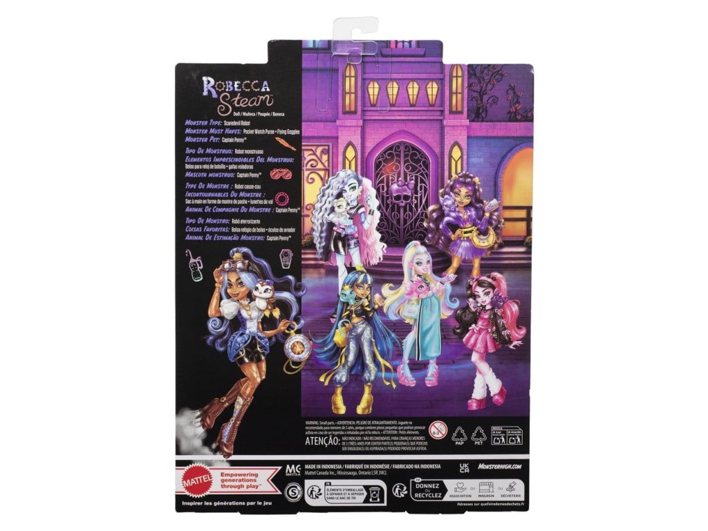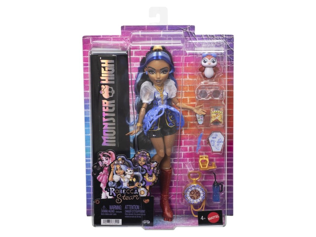 To je Robecca Steam! Tato panenka Monster High je robot a miluje létání ve vzduchu se svými raketovými botami. Přichází se sedmi nápaditě krásnými doplňky a svým mechanickým tučňákem, kapitánem Penny. Děti od 4 let si zamilují přidání energické panenky Robecca Steam do své sbírky Monster High. Plně pohyblivá. Panenka nemůže stát sama. Barvy a designy se mohou lišit.