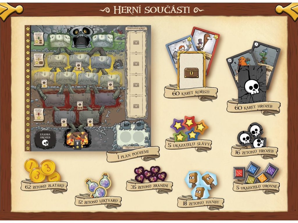 Obsah balení: 60 karet kořisti, 60 karet hrozeb, 62 žetonů zlaťáků, 35 žetonů zranění,