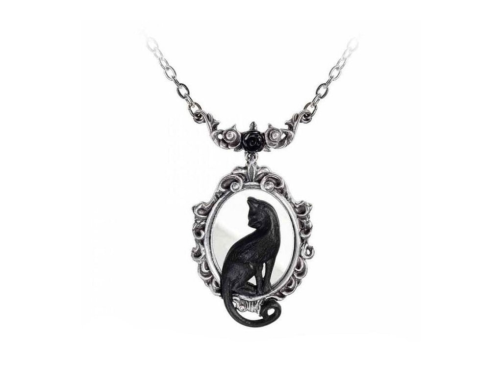 Elegantní kočičí náhrdelník se zrcátkem, tichý, nenápadný a všudypřítomný společník. Přívěsek zpodobňuje kočku, která se dívá do zrcadla se zdobeným rámem, náhrdelník je opatřen zdobeným řetízkem délky 48 cm. Dodejte svému oděvu eleganci s tímto přívěskem „Purrrrfect“.orginální šperk od Alchemy Gothic
