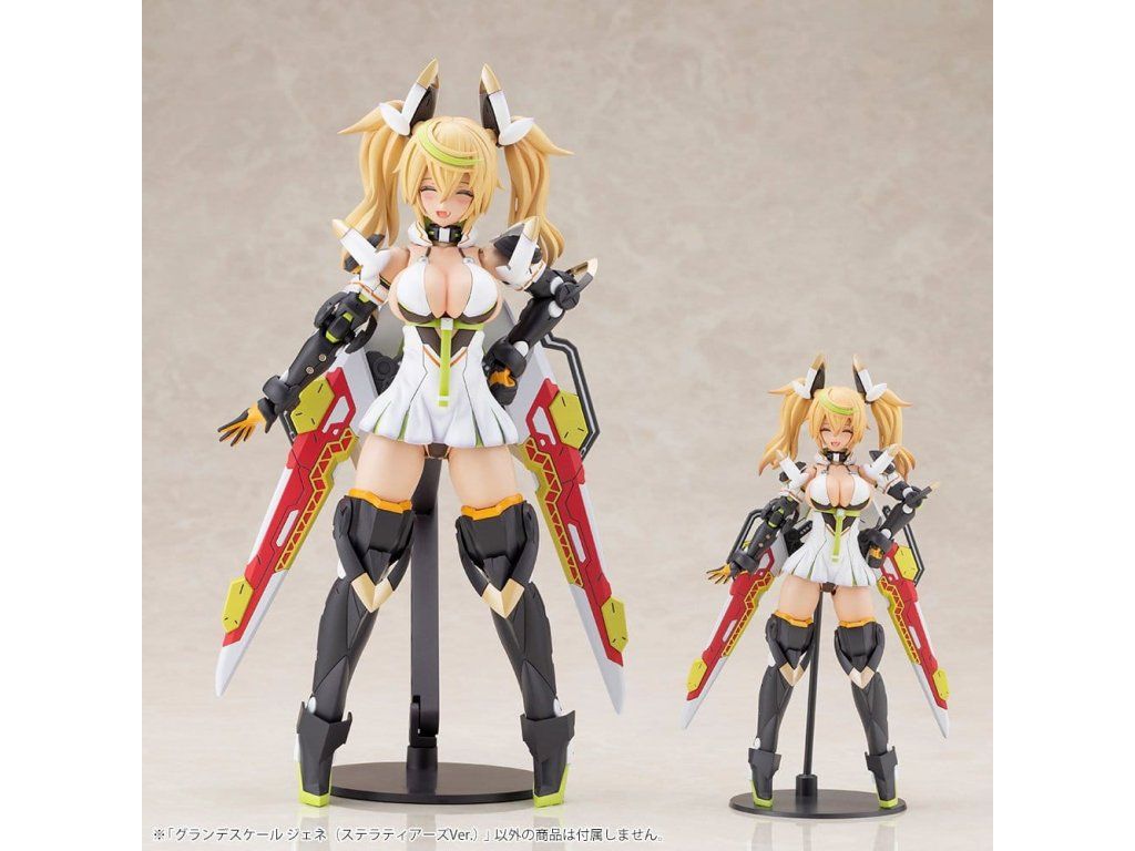 Z Phantasy Star Online 2 se Gene ve svém outfitu Stellatears připojuje k řadě GRANDE SCALE s celkovou výškou přibližně 25 cm! Původní, detailní CAD data Kotobukiya byla zvětšena do formátu GRANDE SCALE. Model věrně reprodukuje vzhled postavy ze hry a díky použití CAD technologie se pyšní vynikajícím rozsahem artikulace, který usnadňuje vytváření póz známých z ilustrací hry. Specifika modelů GRANDE SCALE: Díky větší velikosti modelu byla vylepšena dělení barev a dílů! Fanoušci si tak mohou užít Zene v ještě vyšší kvalitě! Specifikace modelu: - Jsou přiloženy tři části obličeje (usmívající se, smutná, rozrušená). - Tři části obličeje jsou předem nabarvené, což umožňuje sestavit model, který je velmi věrný původní ilustraci postavy. - Zápěstí jsou artikulovaná pomocí kulových kloubů, které umožňují širokou škálu póz. - Model kit obsahuje šest sad PVC částí rukou. Jedna sada obsahuje zcela nové gesto „znak míru“ (gesto 'V') založené na ilustraci k druhému výročí hry. - Co se týče výzbroje, tento kit obsahuje červený Fossil Bauer namísto modrého Fossil Tricks, který byl součástí předchozího kitu. - Přiložený Fossil Bauer lze zobrazit zasunutý nebo s vytaženými křídly. Při nasazené zbrani lze připevnit průhledné čepele. - Jsou přiloženy upevňovací díly pro pevnější přichycení Fossil Bauer k zápěstí modelu. - Upevňovací díly lze také použít k připevnění Fossil Bauer na zadní část pasu. - Kit obsahuje obtisky (decals) pro oči a další označení. Obsah balení: - Části obličeje: 3 typy (usmívající se, smutná, rozrušená) - PVC části rukou: 6 typů (pro levou i pravou ruku) - Dvojitý meč Fossil Bauer - Upevňovací díly pro držení Fossil Bauer - Upevňovací díly pro připojení zbraně a základny - Dedikovaná základna - Obtisky pro oči a další označení Co je to GRANDE SCALE?: GRANDE SCALE je zcela nová řada model kitů, která zvětšuje původní CAD data Kotobukiya do větší, ještě působivější velikosti. Kit kombinuje všechny skvělé vlastnosti většího modelu – od snadnosti sestavení a malování až po rozsah možností hraní a pózování.