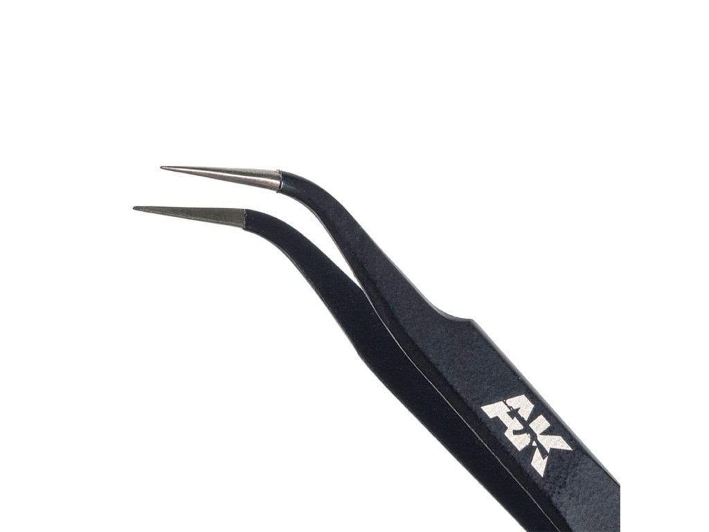 Balení obsahuje zakřivenou nerezovou pinzetu od výrobce AK Interactive.