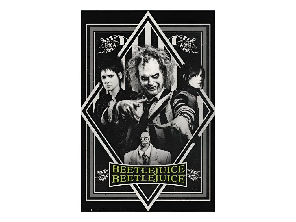 Dlouho očekávaný návrat bio-exorcisty Beetlejuice k rodině Deetzových je tady, a ty je můžeš všechny vidět na tomto skvělém plakátu z filmu Tima Burtona. Černobílý design s výrazným zeleným nápisem Beetlejuice, Beetlejuice dodá tvému pokoji nebo kanceláři skvělou atmosféru z této hororové komedie. Ideální pro milovníky kultovních filmů, a všechny, kdo se nebojí trochy (ne)smrtelné zábavy! Ale nezapomeň, neříkej jeho jméno třikrát za sebou… Certifikát FSC - vyrobeno z udržitelných zdrojů!