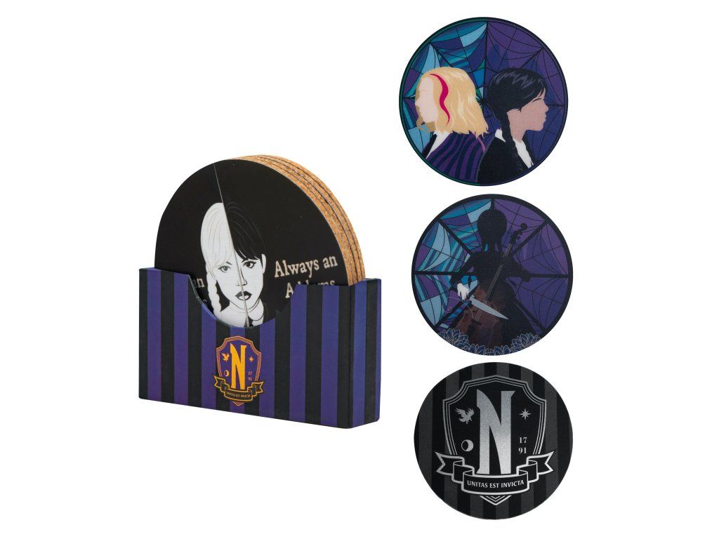 Korkové podtácky s motivy seriálu Wednesday. Ozvláštněte si stůl s Wednesday, Enid, Goody a znakem Akademie Nevermore.