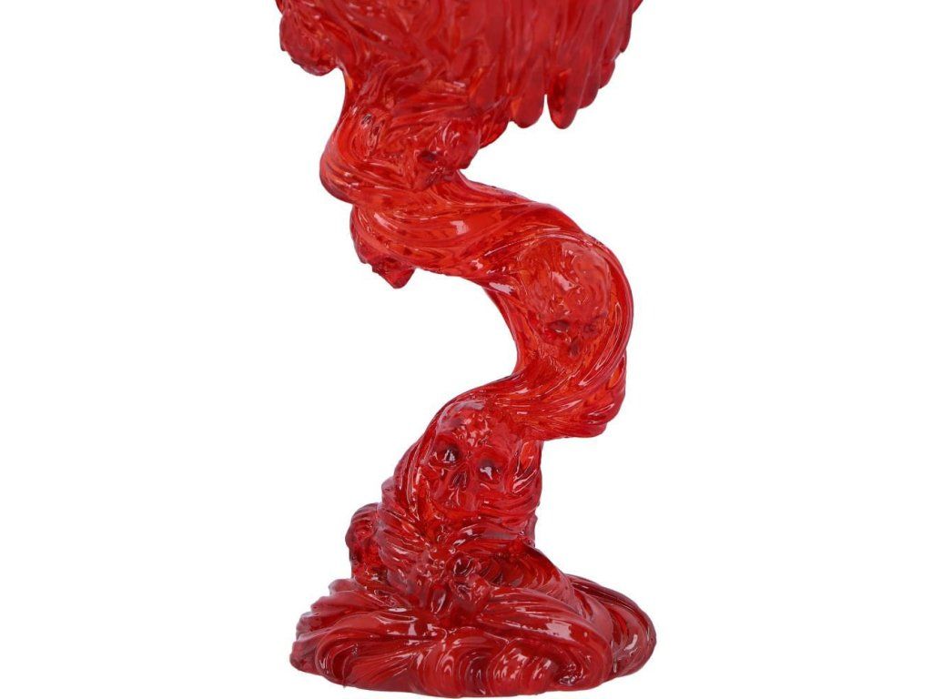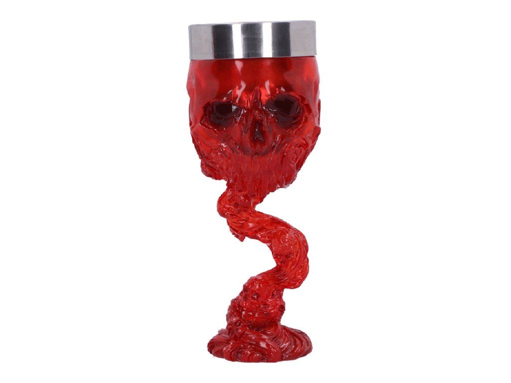 S tímto svůdným rudým pohárem budeš vyzván k tanci s dušemi (ne)mrtvých, jejichž lebky jsou ústředním tématem temného fantasy designu. Vířící duchové krvavé červené barvy se spirálovitě stáčejí a vytvářejí tak stopku poháru, kalichem je zubatá lebka. Celé dílo působí jako z ohně vystupující pán nemrtvých, který tisíce let čekal na čas pomsty či vykoupení pro sebe i své následovníky. Tento kousek potěší jak fanoušky fantasy licencí jako Hra o trůny či Dungeons and Dragons, ale také všechny milovníky magie a sběratele lebek či jiných temných mystických předmětů. Uvnitř poháru se nachází vyjímatelná nerezová vložka pro snadnější údržbu, samotný pohár je z resinu (syntetická pryskyřice). Upozornění: výrobek je ručně malovaný a každý kus se může drobně lišit. Resinová část není vhodná do mikrovlnné trouby ani myčky nádobí.
