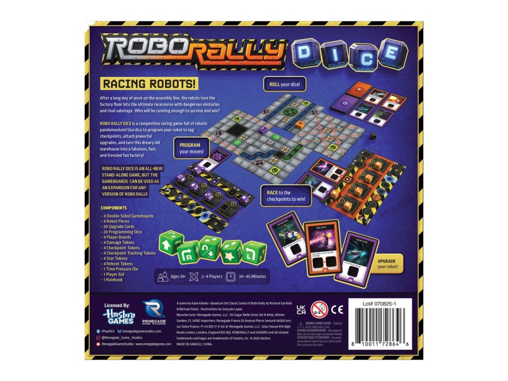 ROBO RALLY DICE je soutěživá závodní hra plná robotického pandemonia! Využijte hrací kostky v reálném čase k programování svého robota, aby označoval kontrolní body, připojoval silné vylepšení a proměňoval toto staré skladiště na skvělou, rychlou a šíleně zábavnou továrnu! ROBO RALLY DICE je zcela nová samostatná hra, ale herní desky lze použít jako rozšíření pro jakoukoli verzi Robo Rally. Balení obsahuje: 4 oboustranné tovární herní desky, 4 kusy robotů, 20 karet vylepšení, 20 programovacích kostek, 4 hráčské desky, 4 žetony poškození, 4 žetony kontrolních bodů, 4 sledovací žetony kontrolních bodů, 4 hvězdné žetony, 4 restartovací žetony, 1 kostka časového tlaku, 1 hráčský návod, 1 pravidla. Hlavní vlastnosti - Rychlá verze klasické deskové hry Robo Rally! - Současně házejte a umisťujte kostky, abyste naprogramovali svého robota pro označování kontrolních bodů, připojování silných vylepšení a závodění na vítězství! - Úplně nová samostatná verze Robo Rally. - Kompatibilní s jakýmkoli herním polem tovární hry z předchozích vydání hry Robo Rally od Renegade Games! Použijte tyto desky v základní hře nebo desky z jiných vydání v této hře. Možnosti jsou nekonečné! - Hráči: 2-4 - Doporučený věk: 14 let a více - Doba hraní: 30-45 minut - Anglická edice.