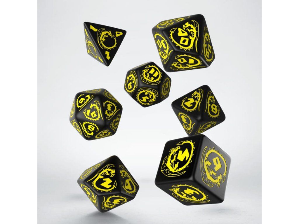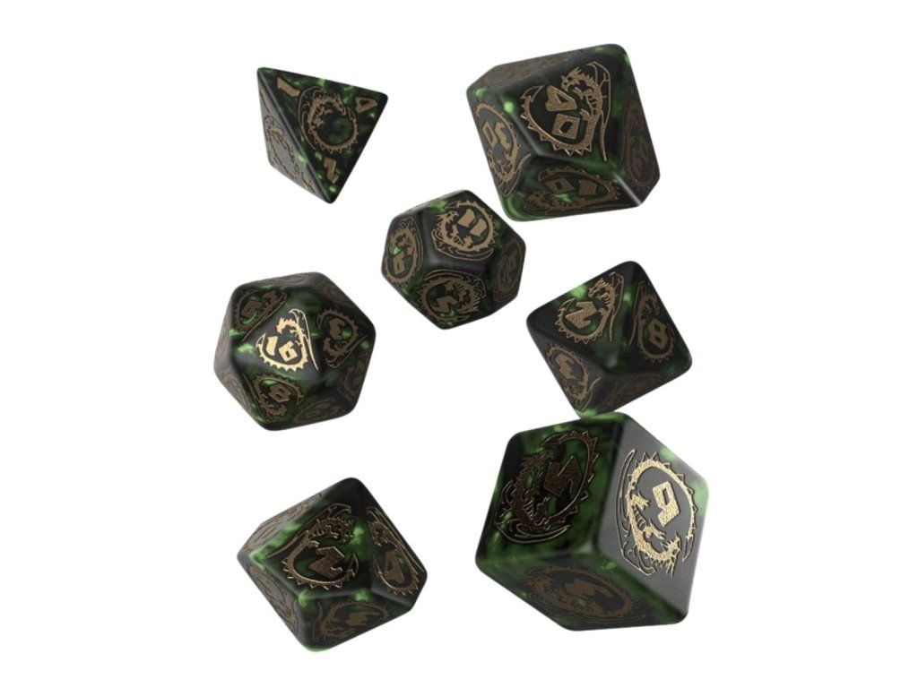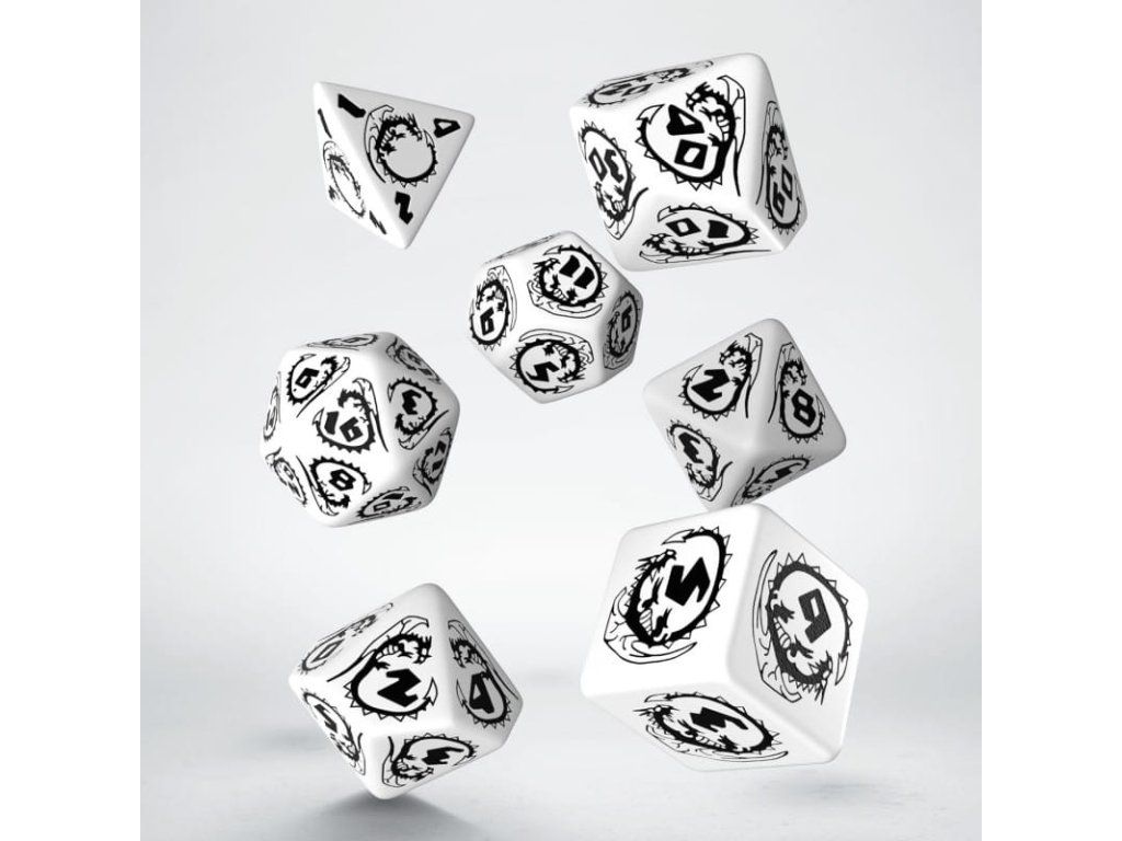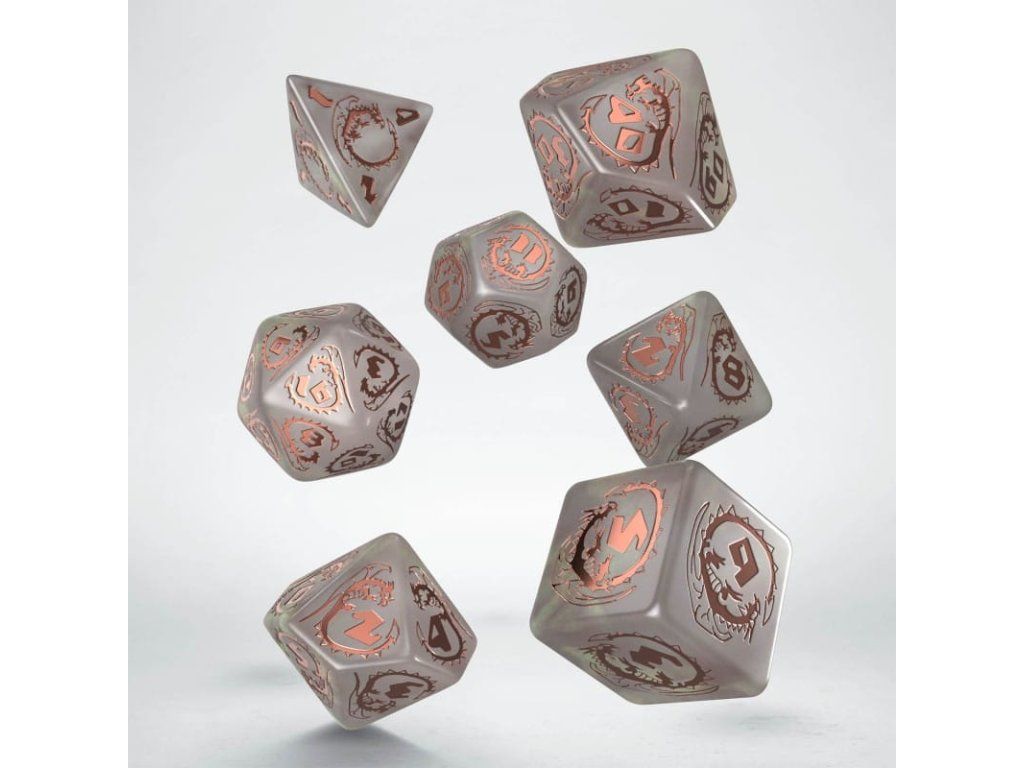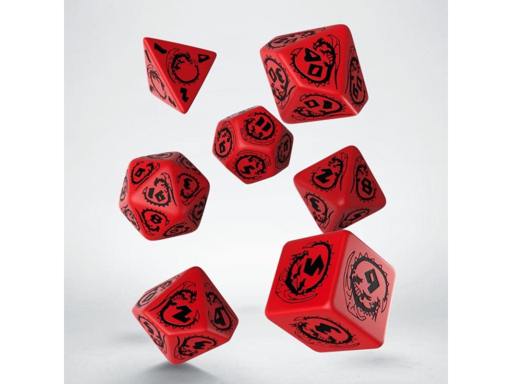 Sada precizně vyvedených kostek zdobených draky, ideální doplněk pro hráče her na hrdiny. Sada obsahuje sedm kostek: čtyř, šesti, osmi, desíti, dvanácti, dvaceti stěnnou a procentovou kostku. Barvy jsou uvedeny vždy v pořadí barva podkladu-barva run. * Povšimněte si prosím netradičního provedení čtyřstěnné kostky - platné číslo je vždy vpravo u základny, jako jediné ze tří je správně otočené.