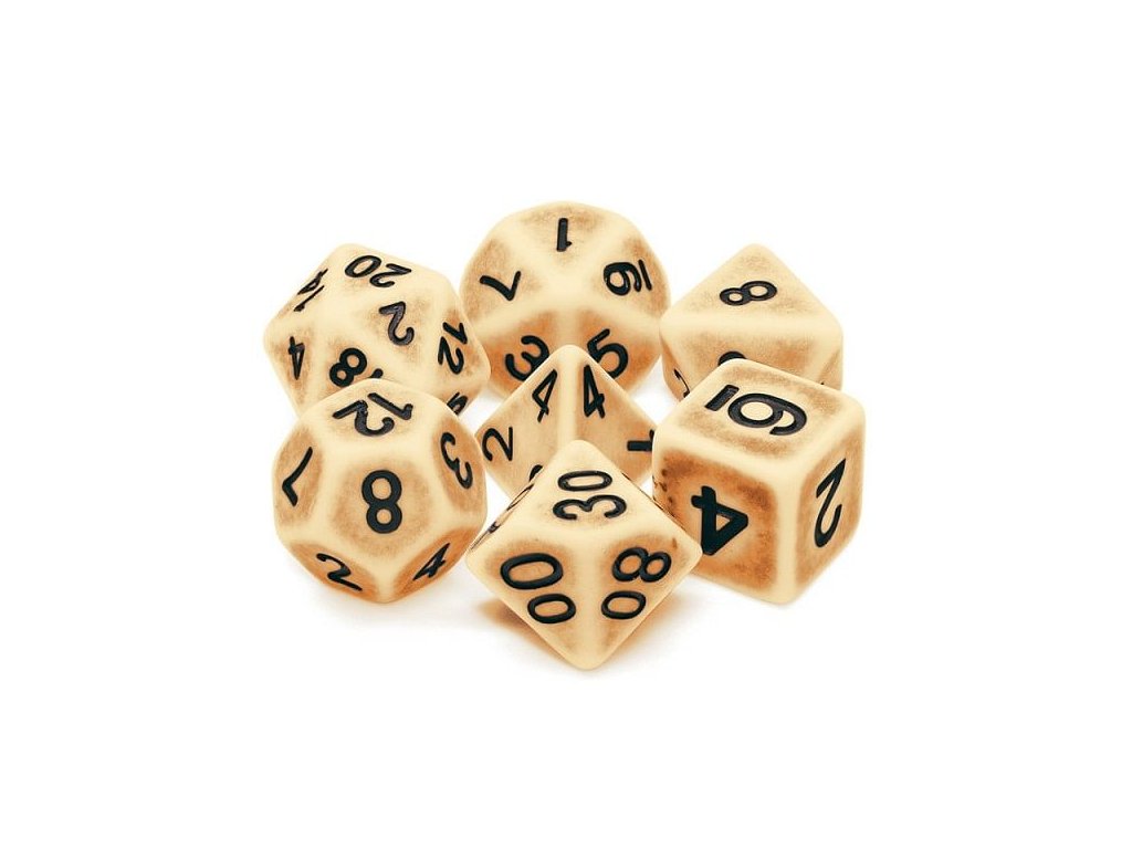 Orginální sada čítající sedm různostranných kostek (k4, k6, k8, k10, k12, k20 a k%), která potěší každého dobrodruha a hráče rpg her. Kostky mají patinu a působí velice autenticky.
