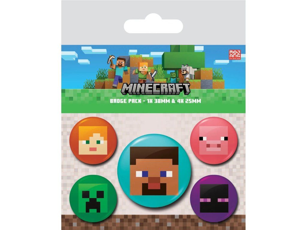 V sadě najdeš 5 ks placek s tvářemi postav z tvého oblíbeného herního světa Minecraftu, mezi nimiž nechybí třeba Steve, Alex, prasátko nebo Creeper. Skvělý stylový doplněk pro tvůj batoh nebo bundu. Balení obsahuje 1x placku o průměru 3,6 cm a 4x placku o průměru 2,4 cm.