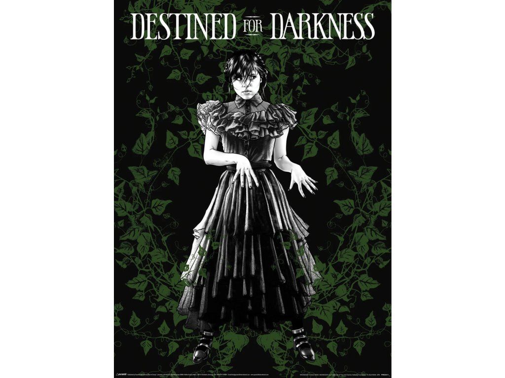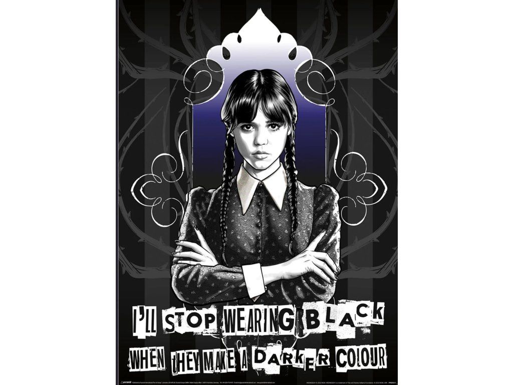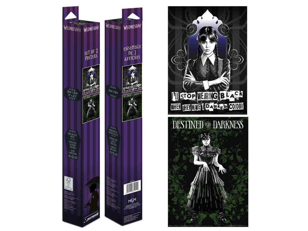 Dva plakáty v jednom balení! Kvalitní tisk (170 g/m²) a lesklá laminace ti zaručí unikátní zážitek při každém pohledu na temnou a krásnou Wednesday. Černo-bílou rebelku na jednom z plakátů s nápisem Destined for darkness zdobí zelené pozadí tančícího břečťanu, na druhém je tradičně přísná dáma s typickým fialovým pozadím a nápisem I ll stop wearing black when they make a darker colour. Rozměry obou plakátů jsou 38 x 52 cm.