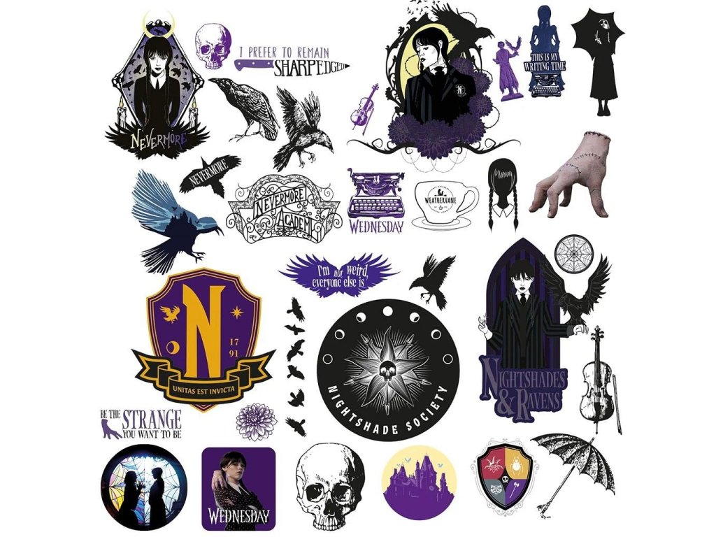 V sadě najdeš na 5 arších 33 vinylových samolepek s motivy ze seriálu Wednesday od Netflixu. Vyzdob si svůj laptop, tablet nebo smartphone v tom správném temném gotickém stylu!