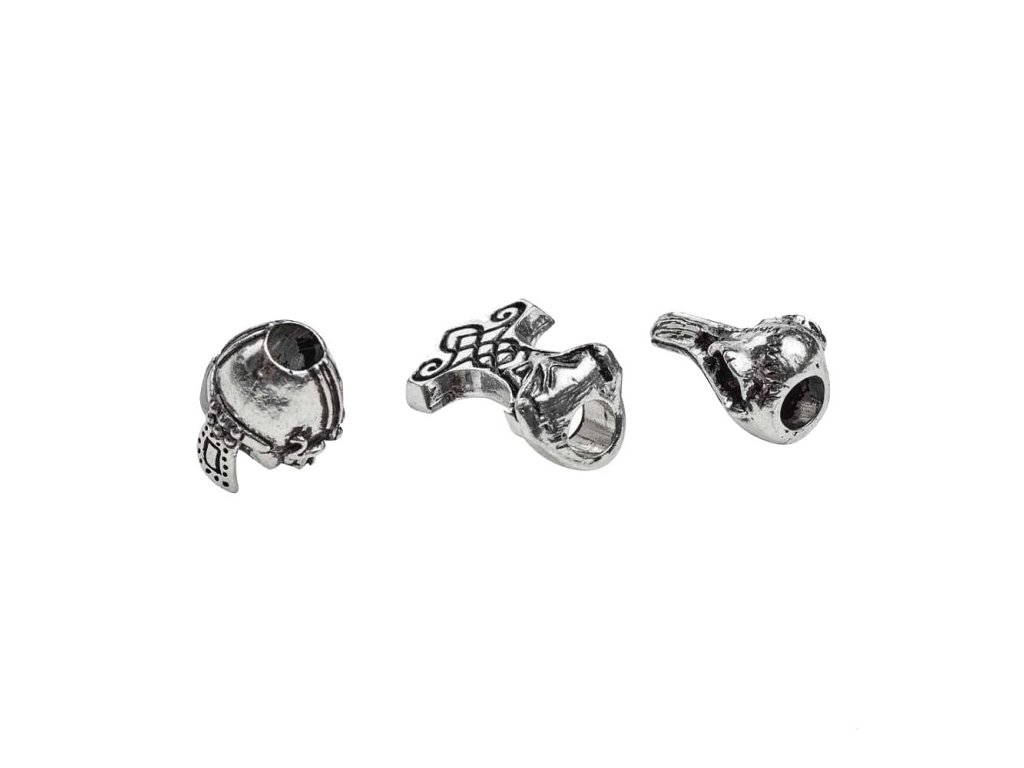 Tato sada tří korálků zkrášlí vlasy či vousy každého vikingského válečníka. Thorovo kladivo Mjolnir, lebka Odinova havrana a válečnická přilba - vše potřebné pro pravého berserka.Rozměry jednoho korálku: cca 2,2 x 1,2 x 1,1 cm