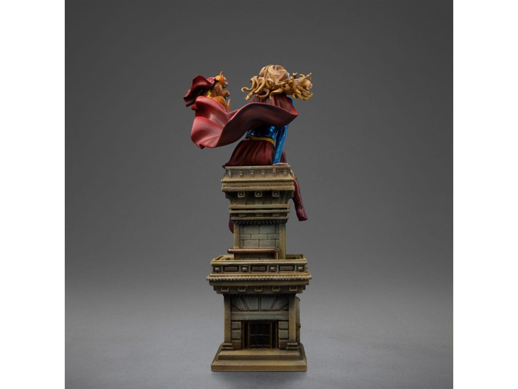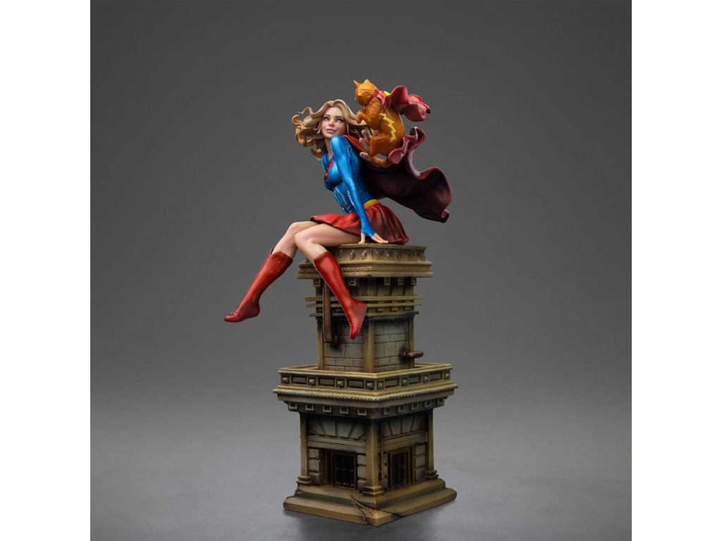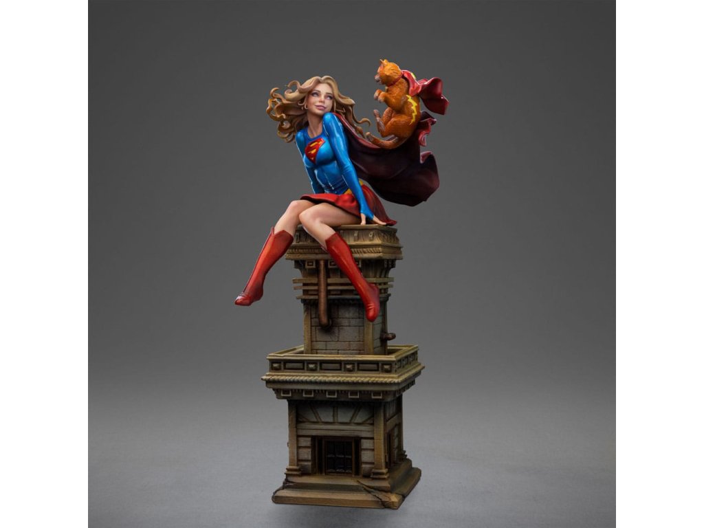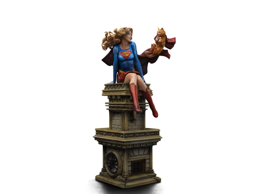 Dívka ze oceli, supermanova sestřenice, dostala sochu od Iron Studios! Usazená nahoře na hodinové věži klasického mrakodrapu, krásná mladá žena s zlatými vlasy, oblečená v charakteristickém modrém a červeném kostýmu s ikonickým "S" emblémem na hrudi, si hravě užívá s její unikátní a speciální kočičkou. Když na ni pohlédneme, okamžitě jsme přeneseni do vrtošivé a zářivé atmosféry, zachycující každý detail mladé hrdinky a jejího průvodce, s dokonalou estetickou věrností ke klasickému zobrazení v komiksech. Jako součást osmé řady inspirované nejikoničtějšími postavami z vesmíru DC Comics, Iron Studios s hrdostí představuje sochu "Supergirl Řada #8 - DC Comics - Art Scale 1/10" se Supermanovou sestřenicí spolu s kočkou Streaky the Supercat, která letí po jejím boku v zábavné a nepředstírané póze, která dokonale vystihuje její hrdinskou a nevinnou podstatu. Když planeta Krypton měla explodovat, vědec Zor-El nastavil loď své dcery Kary, aby následovala loď svého bratrance Kal-El. Kara byla již mladá dívka, zatímco Kal-El byl pouze novorozenecké miminko. Během cesty vesmírem se Kara nacházela v suspendované animaci uvnitř velké části planety, a když dorazila na Zemi, její asteroid se rozpadl a její kosmická loď havarovala v Gotham City, kde ji našel Batman. S dopadem asteroidu se kryptonit stal hojný a získal nové varianty. Osamělá a vyděšená utekla od Batmana a později zjistila, že její bratranec je hrdina známý jako Superman, nyní starší než ona. Vzal ji do Pevnosti samoty, kde se naučila mluvit jazykem Země. Jako Supergirl byla přenesena do 31. století, kde byla uctívána jako člen rodiny Supermana a na čas se připojila k Legii superhrdinů. V současnosti žije Kara, vypadající jako šestnáctiletá dívka, v National City se svými adoptivními rodiči a chodí na střední školu. Ačkoli nevypadá fyzicky starší, Kara je ve skutečnosti starší než její bratranec a strávila na Kryptonu nějaký čas před jeho zničením. Jako taková, na rozdíl od Supermana, má vzpomínky na kryptonickou kulturu stejně jako na rodiče Kal-El. Hledání způsobu, jak neutralizovat smrtící účinky kryptonitu, se Supergirl pokusila vytvořit takzvaný X-Kryptonit. Její kočka Streaky byla vystavena radiaci z této varianty a díky této jedinečné kombinaci X-Kryptonitu získala Streaky super-schopnosti, včetně letu, super-síly, super-vize, super-rychlosti a zvýšené inteligence. Rozměry: 25 x 14 x 11,5 cm.