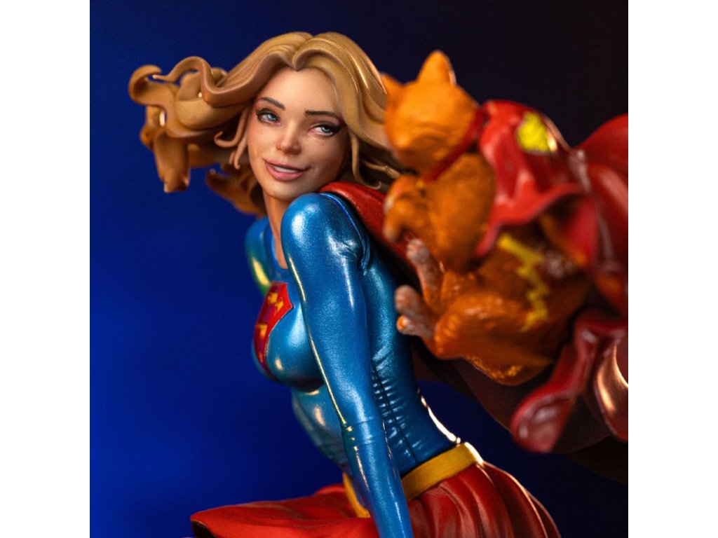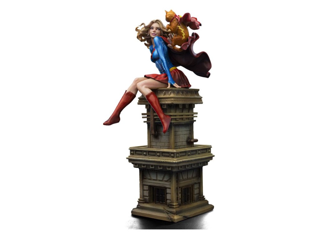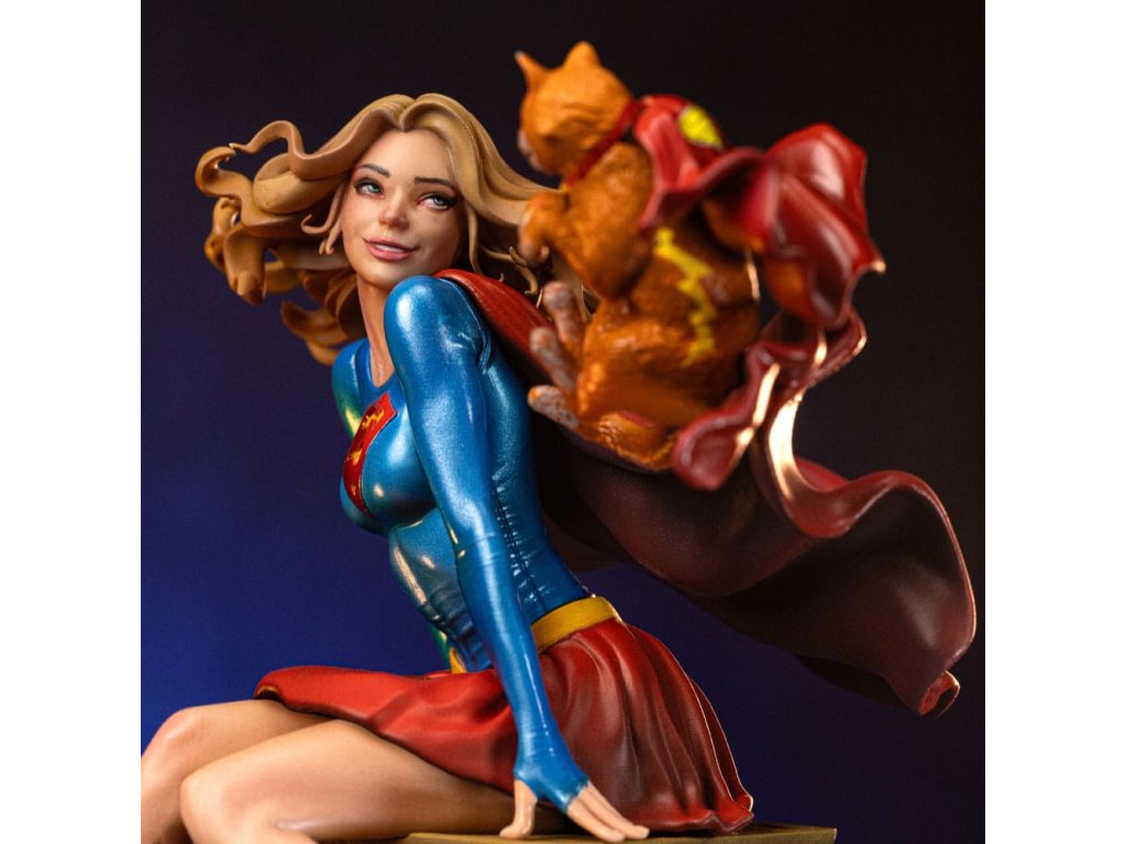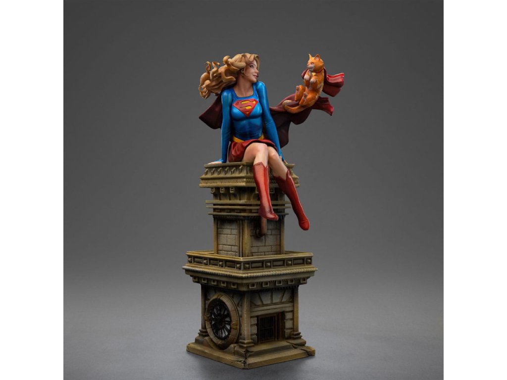 Dívka ze oceli, supermanova sestřenice, dostala sochu od Iron Studios! Usazená nahoře na hodinové věži klasického mrakodrapu, krásná mladá žena s zlatými vlasy, oblečená v charakteristickém modrém a červeném kostýmu s ikonickým "S" emblémem na hrudi, si hravě užívá s její unikátní a speciální kočičkou. Když na ni pohlédneme, okamžitě jsme přeneseni do vrtošivé a zářivé atmosféry, zachycující každý detail mladé hrdinky a jejího průvodce, s dokonalou estetickou věrností ke klasickému zobrazení v komiksech. Jako součást osmé řady inspirované nejikoničtějšími postavami z vesmíru DC Comics, Iron Studios s hrdostí představuje sochu "Supergirl Řada #8 - DC Comics - Art Scale 1/10" se Supermanovou sestřenicí spolu s kočkou Streaky the Supercat, která letí po jejím boku v zábavné a nepředstírané póze, která dokonale vystihuje její hrdinskou a nevinnou podstatu. Když planeta Krypton měla explodovat, vědec Zor-El nastavil loď své dcery Kary, aby následovala loď svého bratrance Kal-El. Kara byla již mladá dívka, zatímco Kal-El byl pouze novorozenecké miminko. Během cesty vesmírem se Kara nacházela v suspendované animaci uvnitř velké části planety, a když dorazila na Zemi, její asteroid se rozpadl a její kosmická loď havarovala v Gotham City, kde ji našel Batman. S dopadem asteroidu se kryptonit stal hojný a získal nové varianty. Osamělá a vyděšená utekla od Batmana a později zjistila, že její bratranec je hrdina známý jako Superman, nyní starší než ona. Vzal ji do Pevnosti samoty, kde se naučila mluvit jazykem Země. Jako Supergirl byla přenesena do 31. století, kde byla uctívána jako člen rodiny Supermana a na čas se připojila k Legii superhrdinů. V současnosti žije Kara, vypadající jako šestnáctiletá dívka, v National City se svými adoptivními rodiči a chodí na střední školu. Ačkoli nevypadá fyzicky starší, Kara je ve skutečnosti starší než její bratranec a strávila na Kryptonu nějaký čas před jeho zničením. Jako taková, na rozdíl od Supermana, má vzpomínky na kryptonickou kulturu stejně jako na rodiče Kal-El. Hledání způsobu, jak neutralizovat smrtící účinky kryptonitu, se Supergirl pokusila vytvořit takzvaný X-Kryptonit. Její kočka Streaky byla vystavena radiaci z této varianty a díky této jedinečné kombinaci X-Kryptonitu získala Streaky super-schopnosti, včetně letu, super-síly, super-vize, super-rychlosti a zvýšené inteligence. Rozměry: 25 x 14 x 11,5 cm.
