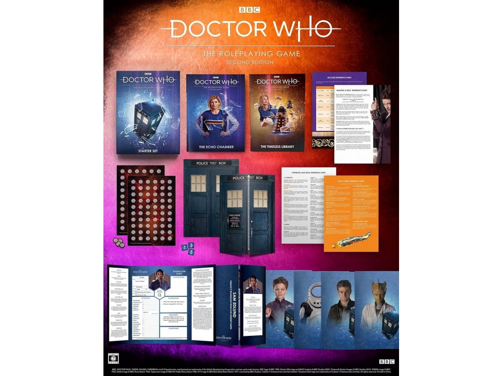 Doctor Who RPG: Starter Set (druhé vydání) obsahuje vše potřebné, abyste se mohli vypravit za dobrodružstvím napříč prostorem a časem. Sada je v angličtině. Doctor Who: The Roleplaying Game Starter Set contains everything you need to start your adventures across all of space and time. Whether you’re a complete beginner at roleplaying games or looking for an epic new campaign, this boxed set is the perfect starting point for anyone wanting to experience the vast universe of Doctor Who. The Timeless Library is a brand new adventure for players of all experience levels. It sends a group of new and varied companions on a journey to a vast library filled with dangerous artefacts and even more dangerous invaders. The story continues in the epic campaign The Echo Chamber and a quest to recover The Hermit’s Lantern, providing new and established characters a wealth of adventure that will take them to surprising new worlds.