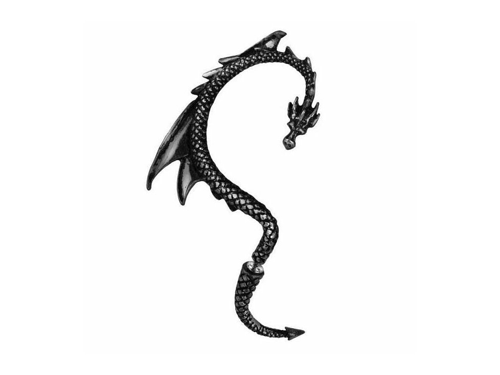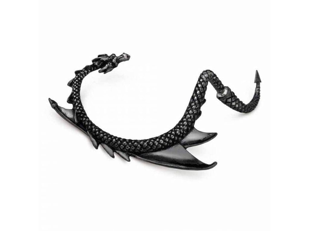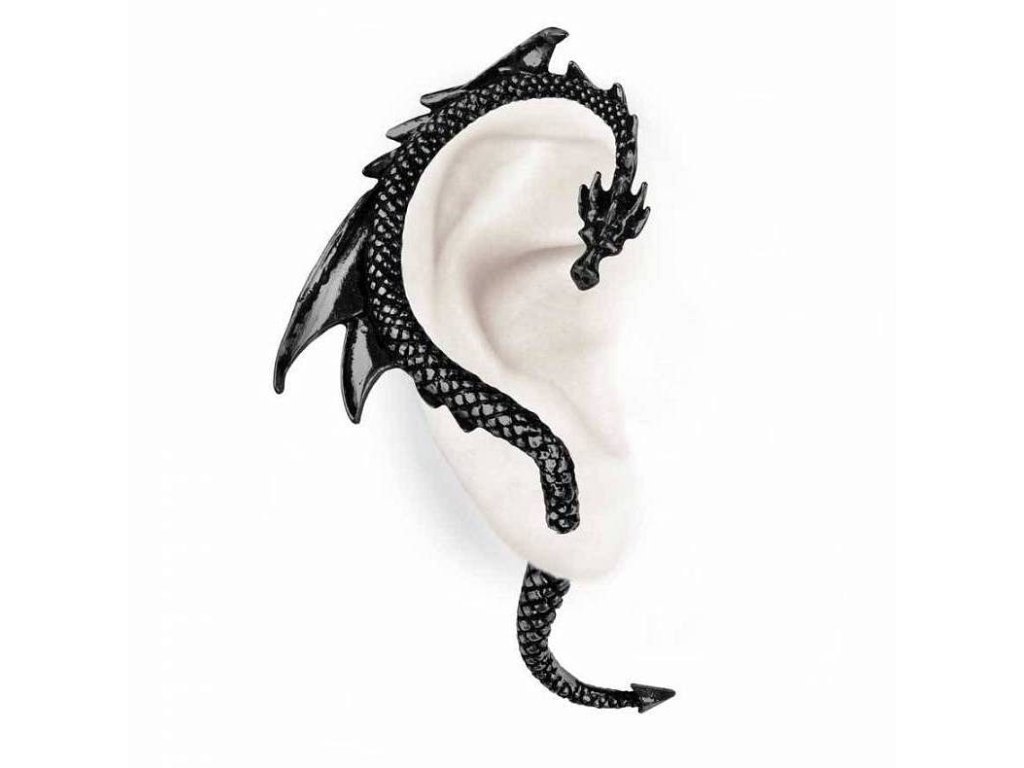 Limitovaná černá edice unikátní pewterové náušnice tvaru draka, který se obtáčí okolo ušního lalůčku a prochází skrze něj. Náušnici lze nosit pouze na pravém uchu. Délka od spoje k hornímu ohybu draka je cca. 6 cm. Jedná se o klasickou náušnici, nikoli roztahovák. Drak má sundávací ocásek, který se nasazuje z druhé strany dírky.materiál: kvalitní anglický cín