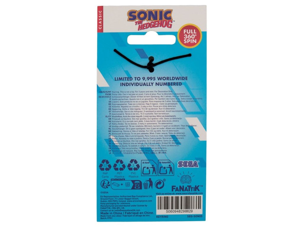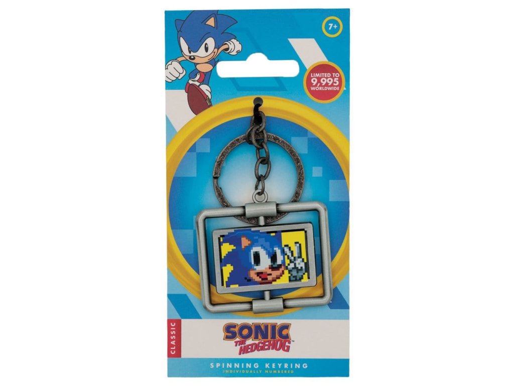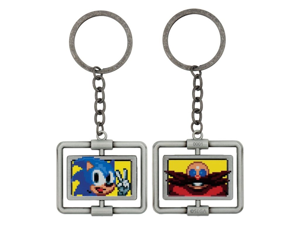 Na konci každého úrovně v první hře Sonic, vydané před 35 lety, minete ceduli Dr. Eggmana, která se otáčí a odhalí obrázek Sonicu, jak běží kolem ní. Tato cedule je zde vytvořena ve formě klíčenky, přičemž středový prvek se otáčí, aby ukázal buď Sonicu, nebo Eggmana. Každý kus je na zadní straně očíslován a počet kusů je omezen na 9 995 po celém světě. - Oficiálně licencované - Omezeno na 9 995 - Individuálně očíslované na zadní straně - Velikost 40 x 50 mm - Otáčející se středový prvek.