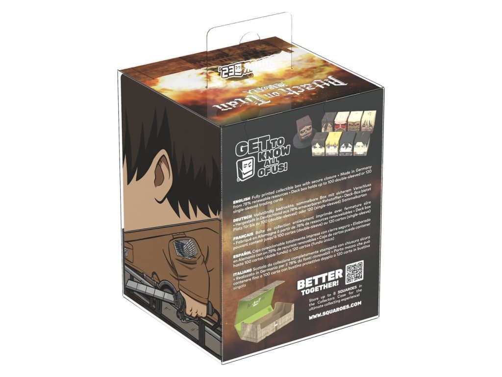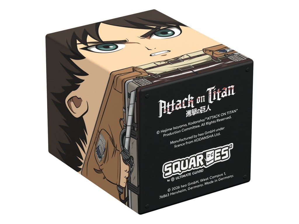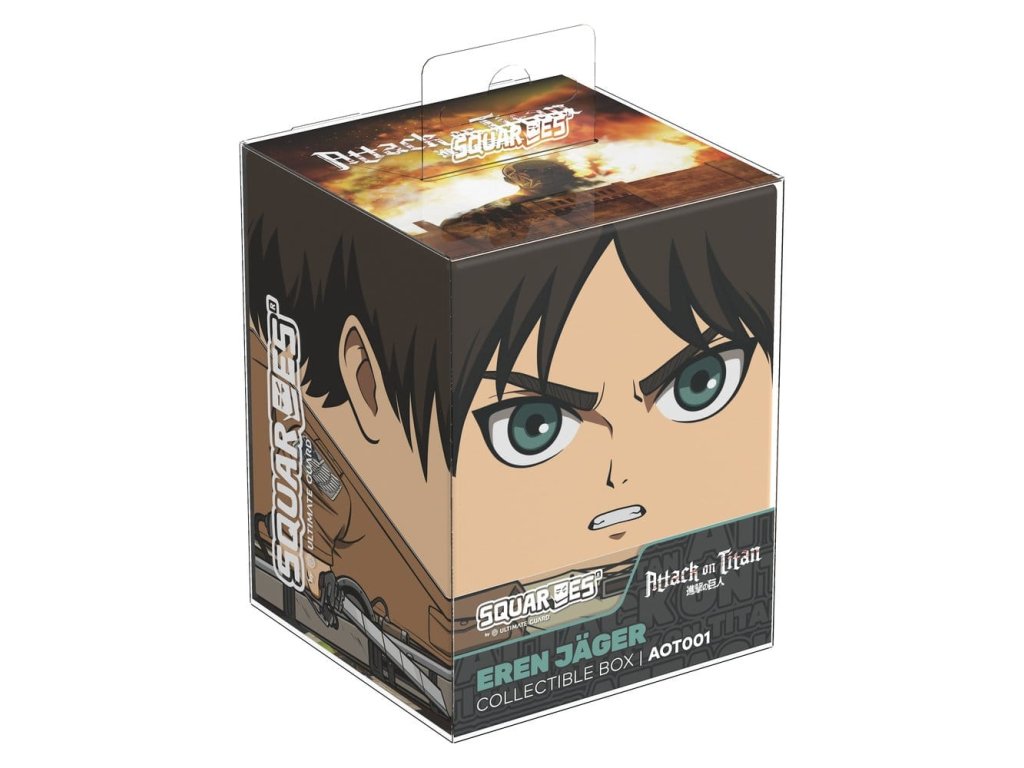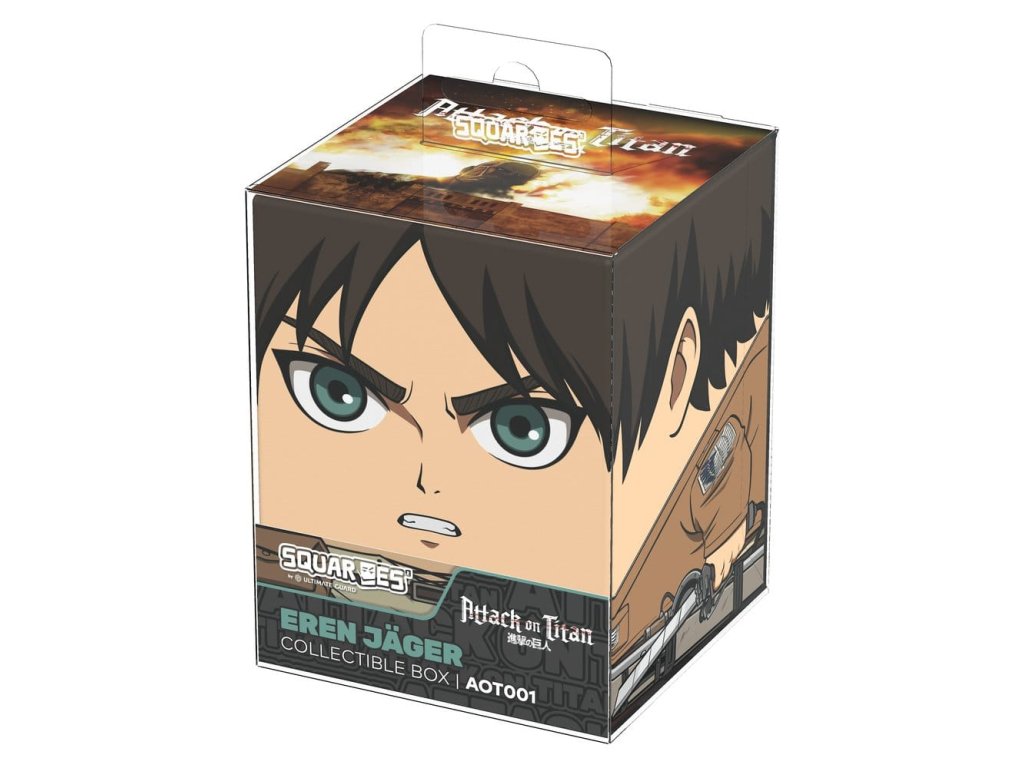 Sběratelská krabička pro ukládání balíčků TCG, příslušenství pro stolní hry a/nebo sběratelských předmětů. Eren Jäger Squaroe z edice Útok na Titány pojme až 100 karet v dvojitých ochranných obalech, pokud je používán jako krabička na karty. Squaroes jsou vyrobeny z 78% obnovitelných zdrojů a dokonale zapadají do samostatně dostupné Sběratelské krabičky.
