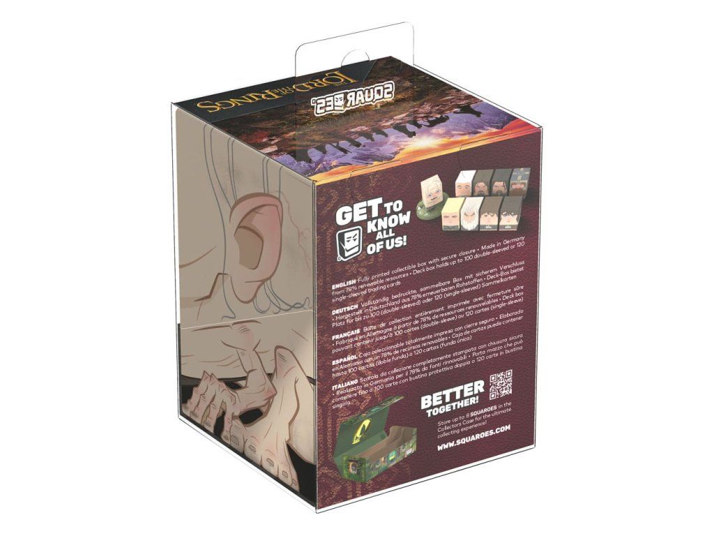 Squaroes od Ultimate Guard jsou další generací příslušenství pro TCG! Vyrobené z vysoce kvalitních materiálů, ze 78 % z obnovitelných zdrojů, kombinují vynikající ochranu karet se sběratelskou hodnotou díky exkluzivním motivům, omezeným jednorázovým potiskům a deck boxům v různých raritách. Squaroes z Pána prstenů pojmou až 100 standardních nebo japonských karetních karet (např. Magic: The Gathering, Pokémon, Lorcana, Flesh and Blood, Yu-Gi-Oh!, Riftbound a One Piece) v dvojitých ochranných obalech*. Jako nová varianta oblíbeného deck boxu Boulder od Ultimate Guard nabízí Squaroes mimořádně pevné pouzdro s bezpečným uzávěrem, které je přitom snadné a pohodlné k otevírání.