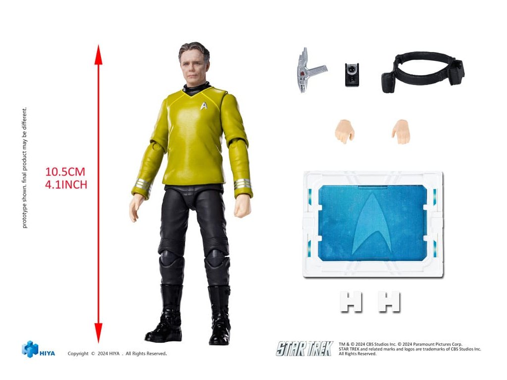 S hrdostí oznamujeme, že produkt řady EXQUISITE MINI Series ze Star Trek™ pochází z časové linie Kelvin, jak je vidět ve filmu Star Trek z roku 2009, akční figurka Pike v měřítku 1/18. Kapitán Christopher Pike z U.S.S. Enterprise sloužil jako mentor a průvodce Kirka, inspiroval Kirka a pomáhal mu se stát výjimečným vůdcem a bojovníkem. Jednoho dne naléhavá situace na Vulcanu vyvolává nutnost osádky nově uvedené lodi U.S.S. Enterprise složené z nadějných nových kadetů. Tato posádka se vydá na dobrodružství v konečné hranici, kde se mění stará legenda a začíná nová verze. Tato zbrusu nová akční figurka Pikea je vysoká 10,5 cm a věrně reprodukuje jeho vzhled ve filmu Star Trek z roku 2009. Je oblečen v ikonické žluté uniformě symbolizující velení a strategický personál. Emblém Starfleetu na jeho oblečení, komunikátor, phaser a další doplňky jsou všechny jemně detailní, zachycují podstatu jeho charakteru i v měřítku 1/18. Figurka má 17 bodů pohybu, využívá nové tělo pro širší rozsah pohybu, umožňuje vám rekonstruovat různé dynamické akční pózy z filmu. Součástí jsou 2x vyměnitelné díly rukou pro zobrazení různých póz. Je také součástí speciální stojan této série, který má průhlednou modrou základnu ozdobenou logem Star Trek, což vás plně ponoří do atmosféry vesmíru Star Trek.