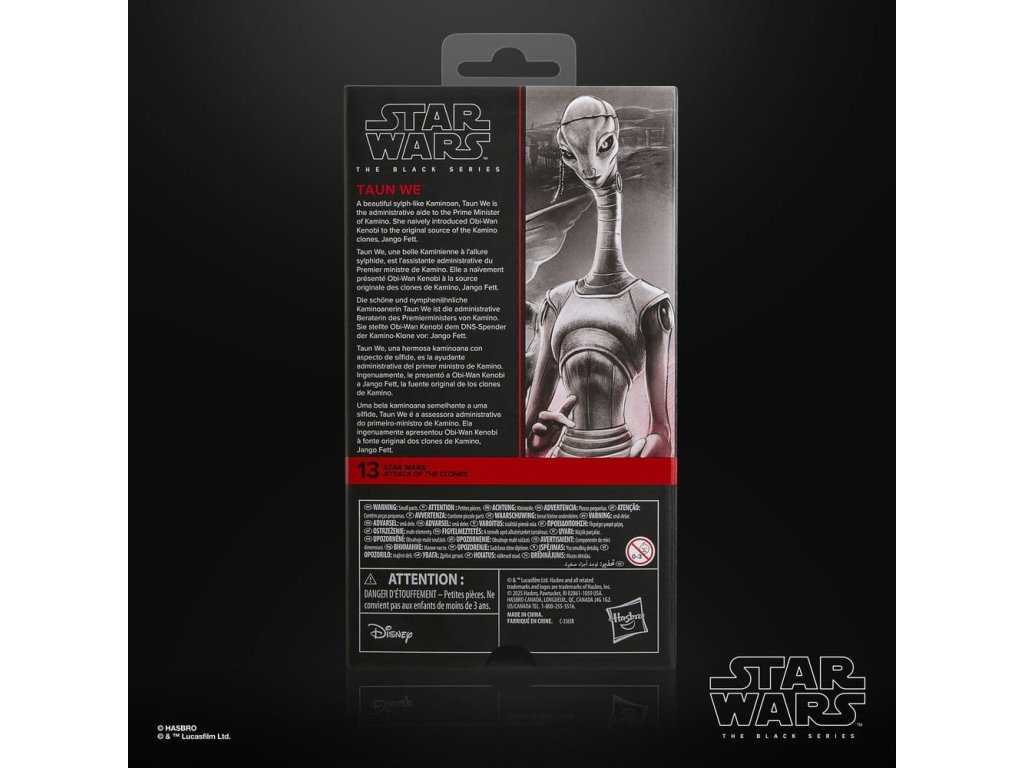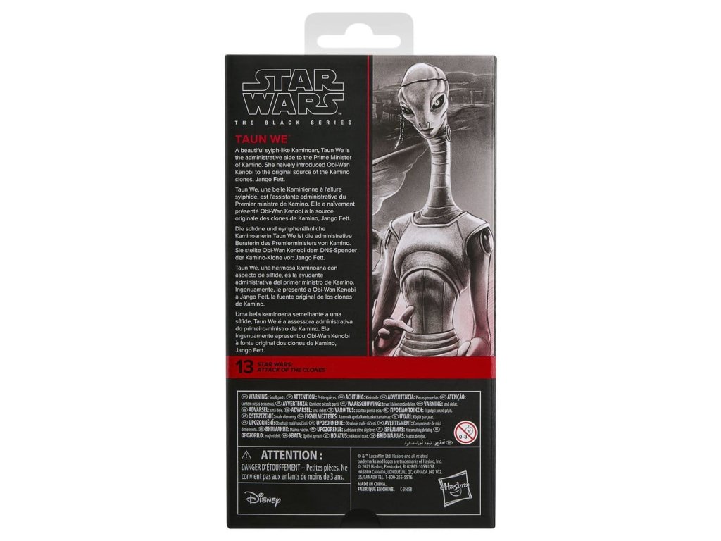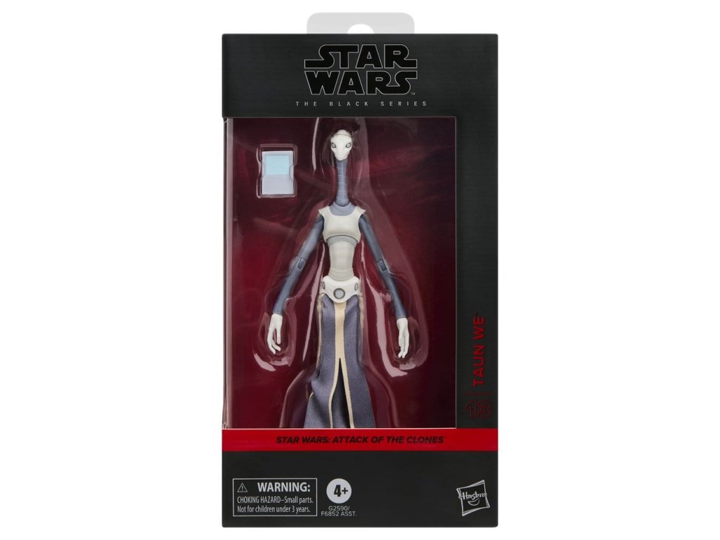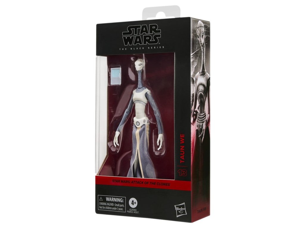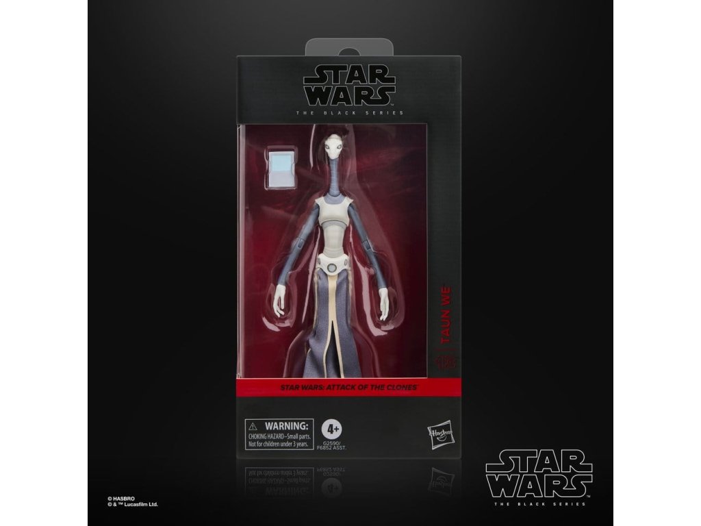 Star Wars The Black Series obsahuje 6 palcové akční figurky, vozidla a předměty pro roleplay z více než 40letého odkazu galaxie Star Wars, které umožňují fanouškům vytvářet galaktické scény s věrností k Star Wars komiksům, filmům, seriálům a více. Tato akční figurka Star Wars od firmy Hasbro je detailně zpracována tak, aby vypadala jako Taun We z filmu Star Wars: Útok klonů. S vynikajícími vlastnostmi a dekorací, Černá série představuje kvalitu a realismus, který milují příznivci Star Wars. Ať je s vámi Síla! (Další produkty se prodávají samostatně. Podléhá dostupnosti.)