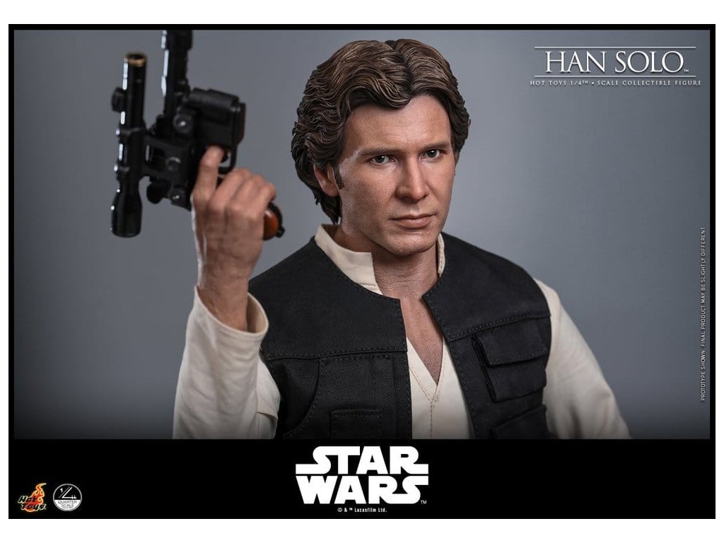 Ve Star Wars: Nová naděje se Han Solo objevuje jako klasický darebácký pašerácký kapitán Hvězdného sokola - cynický, bystrý výstřední z Corellie. Drzý, sebejistý a zpočátku v tom jen kvůli kreditům, následně se po osudovém setkání neochotně přidává k Povstalecké příčině, přičemž předvádí své legendární pilotní dovednosti, ostrý jazyk a překvapivou loajalitu, díky nimž se okamžitě stává ikonou. Sideshow a Hot Toys s hrdostí představují sběratelskou figurku Han Solo & trade; ve velikosti čtvrtiny skutečné velikosti zachycující Harrisona Forda se značnou realističností. Tato figura ve čtvrtinové velikosti má nově vyvinutou hlavu se samostatnými očními bulvamy, detailně zpracovanou jizvu a věrnou kůži. Jeho hnědý krátký účes je pečlivě zpracován, aby odrážel jeho klasický vzhled z Nové naděje. S nově vyvinutým tělem mohou sběratelé vytvořit jeho typické sebevědomé postoje nebo pose připravený k výstřelu. Široký výběr výměnných rukou, včetně čtyř normálních rukou, tří rukavicových rukou, stejně jako šesti rukou s předloktím, poskytuje rozmanité možnosti vystavování přímo z cantiny v Mos Eisley nebo uprostřed bitvy. Hanovo oblečení je věrně padnoucí, jeho vesta je vrstvena přes tričko s výstřihem do V, kalhoty a černý pásek z pravé kůže. Hnědý kůžený praktický pásek je bohatě zdoben stříbrnou přezkou, ozdobami a pouzdrem na blaster z kůže, doplněným párem dlouhých kožených bot, které dotvářejí jeho pašerácký vzhled. Co se týče zbraní, Han je vybavený svou typickou blasterovou pistolí DL-44 a blasterovým puškou E-11, zatímco mezi příslušenstvím najdeme volač droidů a stormtrooperský praktický pásek s kůženým pouzdrem na blaster. Figurka ve čtvrtinové velikosti je vystavena na podstavci s motivem Hvězdného sokola se zmenšeným modelem Hvězdného sokola, logem Star Wars a štítkem s jménem postavy, což z ní dělá nepřehlédnutelný klenot jakékoliv sbírky. Darebácký, legendární a vždy lump se srdcem ze zlata - tato úžasná figurka Han Sola ve čtvrtinové velikosti je nepřehlédnutelným klenotem jakékoliv sbírky Star Wars.