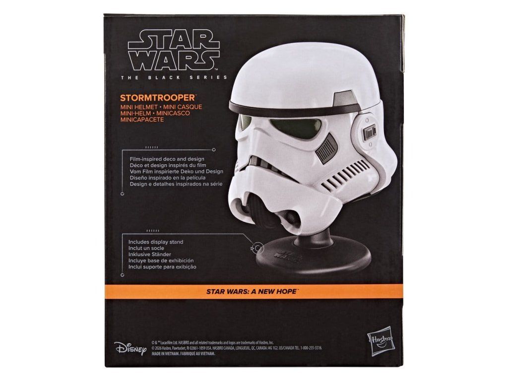 S mini helmami Star Wars z řady The Black Series mohou fanoušci i sběratelé vzdát hold své oblíbené franšíze z galaxie daleko, daleko odsud! Detailně propracovaná tak, aby vypadala jako helma stormtroopera ze Star Wars: A New Hope™, tato zmenšená helma ze série Star Wars The Black Series je působivým doplňkem na polici každého fanouška. (Další produkty se prodávají samostatně. Dostupnost se může lišit.)