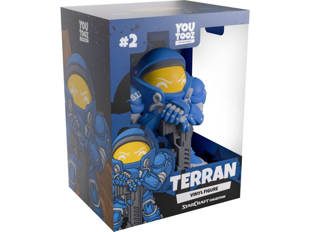 "Připraveni způsobit trochu pekla!" Potřebujeme zde náhradu a potřebujeme ji hned teď! Dobrá věc, že Terran dorazil na Youtooz pro svůj debut! Stojí vysoko 11 cm a jeho ruce spočívají na pažbě šedé pušky, jejíž hlaveň je zaražená do země, zatímco jeho silné nohy jsou pevně umístěny na obě strany připraveny skočit do boje okamžitě! Oblečeni v boji zjizvené modré a šedé brnění, které je pokryté hlubokými šrámy a oděrky s trubkami visícími z výfuku na zádech, bílé oči a zaškrcená obočí září skrze jasně žlutý vizír kulaté přilby. Na vnějším obalu je vidět, jak stojí triumfálně na skalnatém měsíci, zatímco Země je vidět na pozadí, zatímco jeho vnitřek je tmavě modrý a pokrytý Terranovým emblémem. Chránící obal ukazuje modrý a fialový svit Mléčné dráhy a je posetý zářícími hvězdami a jejich figurka je vidět skrze velké průhledné okno na přední straně obalu. Tento sběratelský kousek se dodává v matné, reliefní, ochranné vnější obálce a plastovém chrániči na míru pro maximální ochranu během přepravy. O Starcraftu: Starcraft je RTS videohra vyvinutá a publikována společností Blizzard Entertainment, jejíž první díl byl vydán v roce 1998. Nachází se v daleké části Mléčné dráhy, umožňuje hráči ovládnout jednu ze species bojujících o dominanci sektoru a vytvořil mnoho rozšíření jak pro původní hru, tak pro její pokračování s kritickým uznáním.