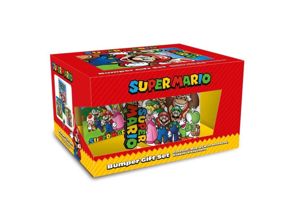 Udělejte radost hráčům a fanouškům legendárního Super Maria z konzolí Nintendo! Tato skvělá dárková sada obsahuje keramický hrnek, podtácek, pryžovou klíčenku a zápisník formátu A5 v kroužkové vazbě, vše s obrázky oblíbených postaviček z her.