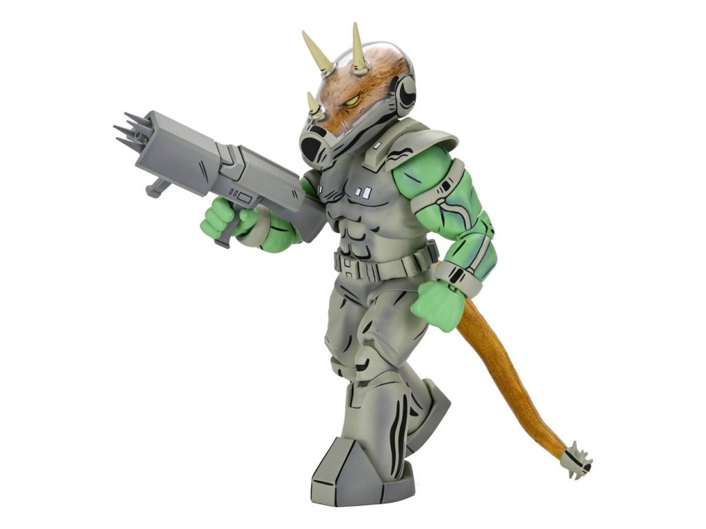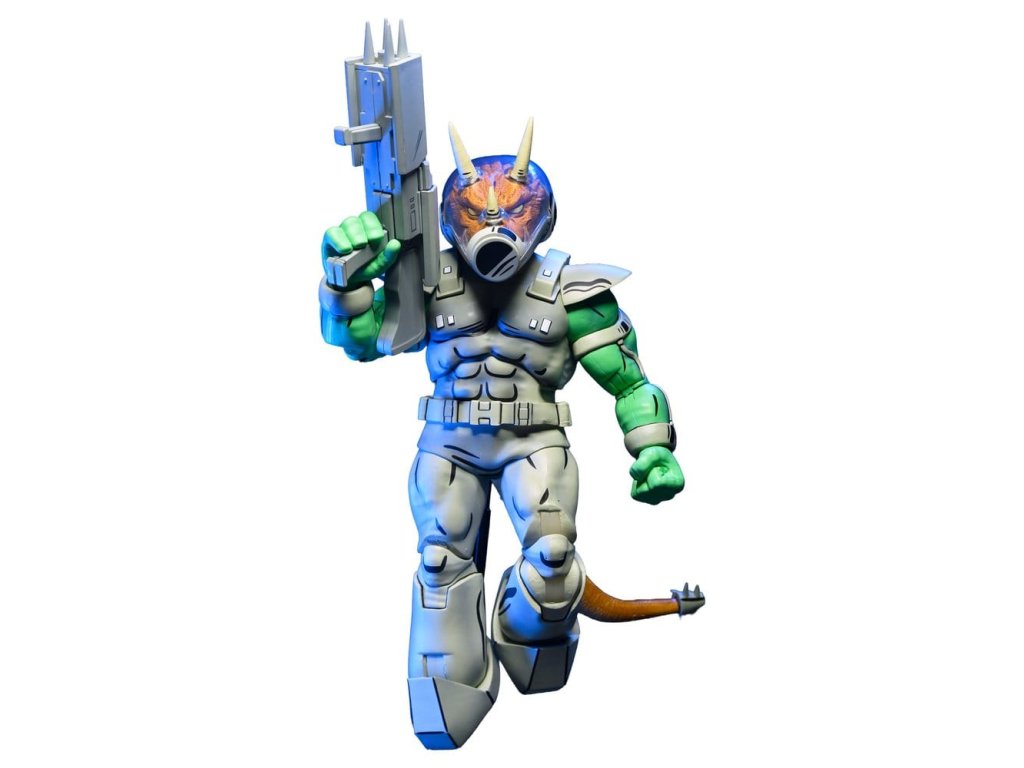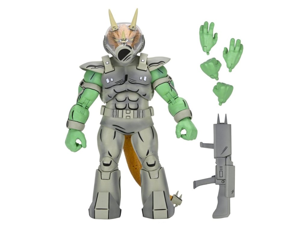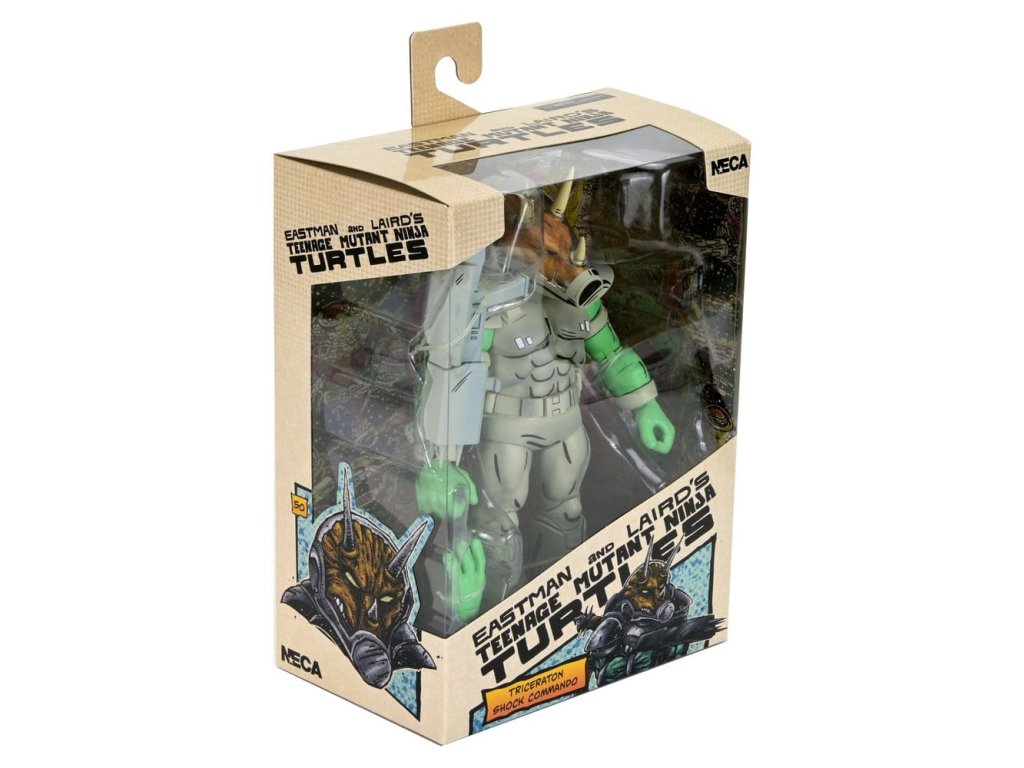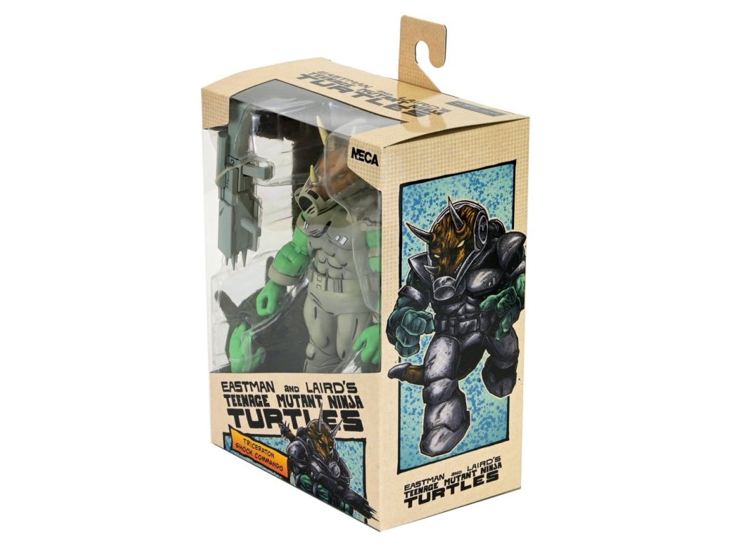 Invaze! Dorazila Republika Triceraton. NECA posílá Shock Commandos s touto luxusní akční figurkou Triceraton - jak je vidět v čísle 5 komiksů Teenage Mutant Ninja Turtles od Mirage Studios! Figurka má zcela nové zpracování, stojí v měřítku 18 cm a má ocas s drátkem pro pózování. Dále je doplněna o výměnné ruce a blaster. Prezentováno v sběratelsky přívětivém okenním balení s ilustracemi od Petera Lairda a Kevina Eastmana.