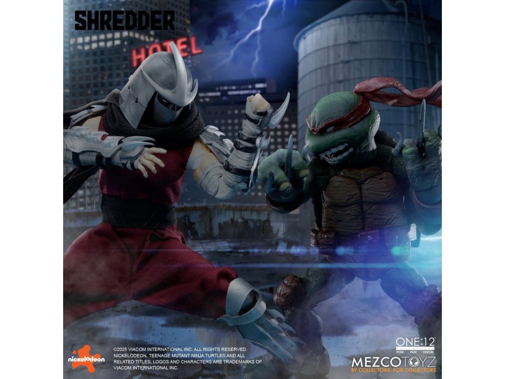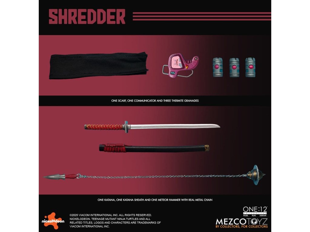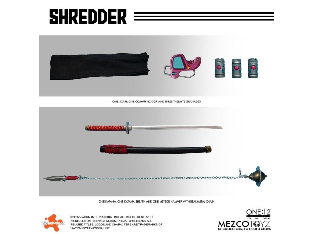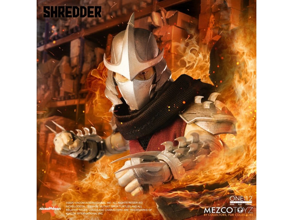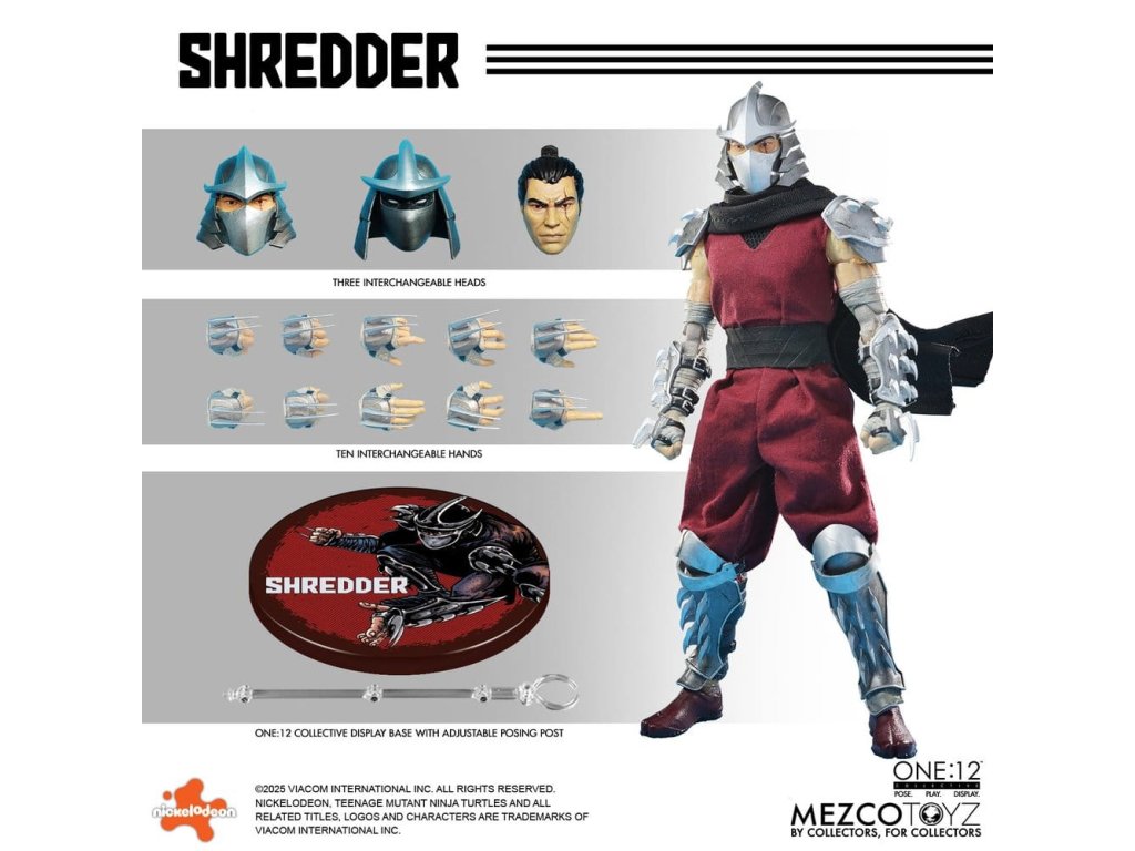 Obávaný vůdce Foot Clanu sestupuje do One:12 Collective! Mistr ninjutsu a přísahalý nepřítel Želv, Shredder se objevuje s impozantním arsenálem, vyměnitelnými portréty, měkkým zbožím a plným nákladem smrtící výbavy. Jeho ikonická přilba Kuro Kabuto je součástí ve dvou jedinečných stylech, spolu s portrétem bez masky Oroku Saki, který ukazuje muže za kovem. Shredder je v protibodové vrstvené zbroji se snímatelnými částmi s čepelemi připravený na totální dominanci. Od jeho meteorového kladiva s reálným kovovým řetězem až po termické granáty a katanu, každá zbraň odráží nemilosrdnou efektivitu Foot Clanu. Různé vyměnitelné ruce mu umožňují držet, pokynout, útočit a zastrašovat v jakémkoli postoji. Po vzestupu ve Foot Clanu a získání vedení skrze strach, moc a přesnost, Oroku Saki, nyní známý pouze jako Shredder, ovládá kriminální podsvětí ze stínů. Jeho mise: zničit Želvy ninja mutanta a obnovit nadvládu Foot Clanu. FIGURKA SHREDDER ONE:12 COLLECTIVE OBSAHUJE: - Tělo One:12 Collective s více než 28 body pohybu - Ručně malované autentické detaily - Přibližně 17 cm vysoký - 3 hlavové portréty - Hlava s přilbou Kuro Kabuto, výchozí - Hlava s přilbou Kuro Kabuto, bojově připravená - 1 odhalená hlava VÝMĚNNÉ RUKY: - 12 vyměnitelných rukou - 1 pár pěstí (L&R) - 1 pár rukou pro pózování (L&R) - 1 pár rukou pro držení (L&R) - 1 pár rukou na držení katany (L&R) - 1 ruka na držení komunikátoru (L) - 1 ruka na držení termické granátu (R) - 1 ukazující ruka (L) KOSTÝM: - Obvod hrudi s tkaninovými vrstvami - Ramenní nášivky - Předloktí gaunlets - Shin armor - Tkaný overal - Pás se závěsem na zbraně PŘÍSLUŠENSTVÍ: - 1 meteorové kladivo s reálným kovovým řetězem - 1 katana - 1 pochva katany - 3 termické granáty - 1 komunikační zařízení - 1 displej One:12 Collective s logem - 1 nastavitelný displejový příspěvek One:12 Collective Figurka Želvích Ninja Mutantů Shredder od One:12 Collective je zabalená v krabici přívětivé pro sběratele, navržené s ohledem na sběratele. Orientační datum vydání: říjen 2026