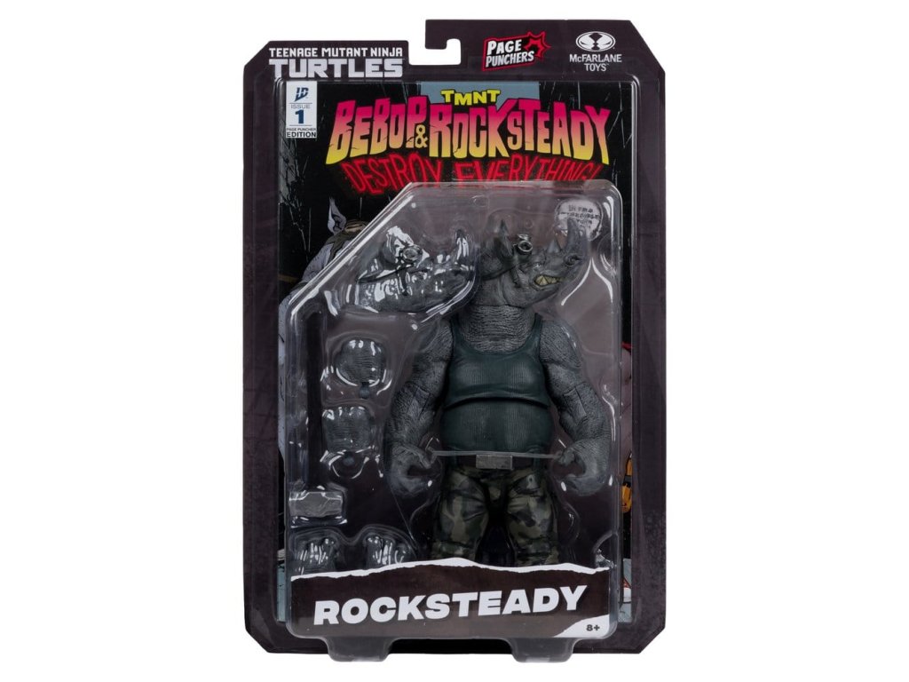 Nemotorní Bebop a Rocksteady jsou po své porážce od Želv cítit poražení a bez účelu. Nicméně, když narazí na hůl na cestování časem, uvědomí si, že je čeká jejich nejšílenější a nejdestruktivnější dobrodružství! Přežije vesmír? - 5? měřítko ultra pohyblivé akční figurky je založeno na obrazech s Teenage Mutant Ninja Turtles od vydavatelství IDW Publishing - Součástí je alternativní hlava, 2 extra ruce, 2 extra nohy a kladivo - Součástí je také exkluzivní reprint komiksu "Page Puncher Edition" od vydavatelství IDW Publishing - Balení na blisterové kartě s tématem Bijců stránek s Teenage Mutant Ninja Turtles - Sbírejte všechny figurky Bijců stránek s TEENAGE MUTANT NINJA TURTLES™ od McFARLANE TOYS™. Orientační datum vydání: únor 2026