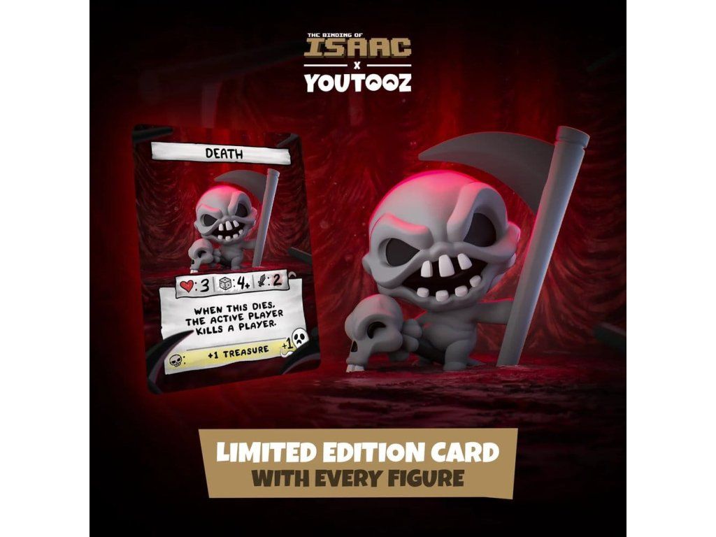 "Smrt nečeká nikoho" — víme, co jste právě řekli, ale počkejte! Jsme na to ještě příliš mladí, abychom umřeli! Aha, nejste tu kvůli tomu? Jezdec měří 8 cm a sedí na tenkém těle svého kostlivého koně a drží v levé ruce obrovskou kosu; jeho tmavě šedá hlava se svírá do děsivého úsměvu s masivními zuby, zatímco prázdné oči vykukují zpod mohutného čelního oblouku a jeho trup se sklání nad zaobleným břichem. Vnější strana balení zobrazuje ošuntělou stránku s kosou na pozadí popraskané podlahy, zatímco vnitřek je zcela černý s jediným reflektorem svítícím na figurku. Ochranný obal pak nahlíží do pekelně červené místnosti plné kostí, přičemž figurka je viditelná skrz velké průhledné okénko vpředu. Tato sběratelská položka je zasílána v matném, raženém ochranném přebalu a v plastovém ochránci na míru pro maximální ochranu při přepravě. O hře The Binding of Isaac: The Binding of Isaac je náhodně generovaná akční RPG střílečka s výraznými prvky rogue-like, kterou vyvinuli Edmund McMillen a Florian Himsl. Hráči provázejí Isáka na jeho cestě za bizarními poklady, které mění jeho podobu, dávají mu nadlidské schopnosti a umožňují mu bojovat s tajemnými tvory, odhalovat tajemství a probojovat se k bezpečí.