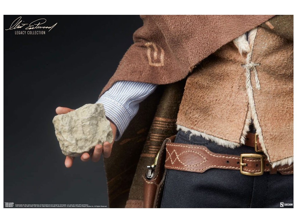 Sideshow představuje figurku Muže bez jména v šestinásobné velikosti, první figurku z Eastwoodovy kolekce dědictví, která oslavuje jeho obsáhlou kariéru ve filmu. Na základě vzhledu Clinta Eastwooda ve spaghetti westernu Sergia Leoneho Dobrý, zlý a ošklivý, figurka Muže bez jména v šestinásobné velikosti má pečlivě vytvořený, ocelově vyhlížející portrét s neodstranitelným kloboukem a doutníkem. Tento tajemný tulák, kterého Tuco nazývá 'Blondie', má na sobě šité oblečení včetně košile, kalhot, opasku s pouzdrem na pistoli, vesty z umělé kůže s umělým kožíškem, šátku a odnímatelného pláště. Figurka Muže bez jména v šestinásobné velikosti je ohybná a umožňuje mnoho možností zobrazení s doprovodnými dalšími rukama a příslušenstvím. Mezi nástroje tohoto lovece odměn patří pistol s designem hadího úchopu, velká puška, kámen a ostruhy na patách jeho bot. Figurka také obsahuje celkem devět rukou - pár pěstí, pár relaxačních rukou, pár rukou pro gesta, pravou ruku držící pušku, levou ruku podporující pušku a pravou ruku držící pistol. Vytvořte dynamické a dramatické pózy pro pistolníka na vaší polici se sbírkou západních suvenýrů a vzdajte hold této ikonické postavě z kinematografie. Pokud máte v kapse hořící díru od pár dolarů, určitě si pořiďte figurku Muže bez jména v šestinásobné velikosti od Sideshow z Eastwoodovy kolekce dědictví.