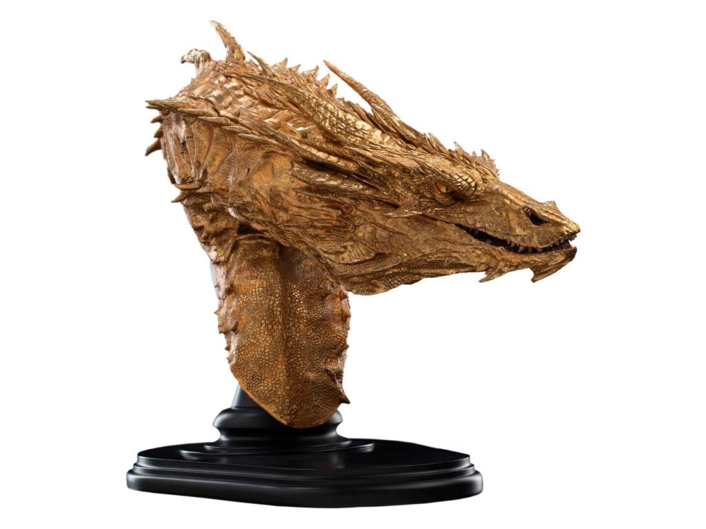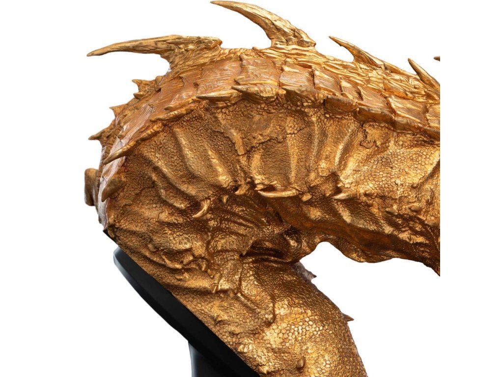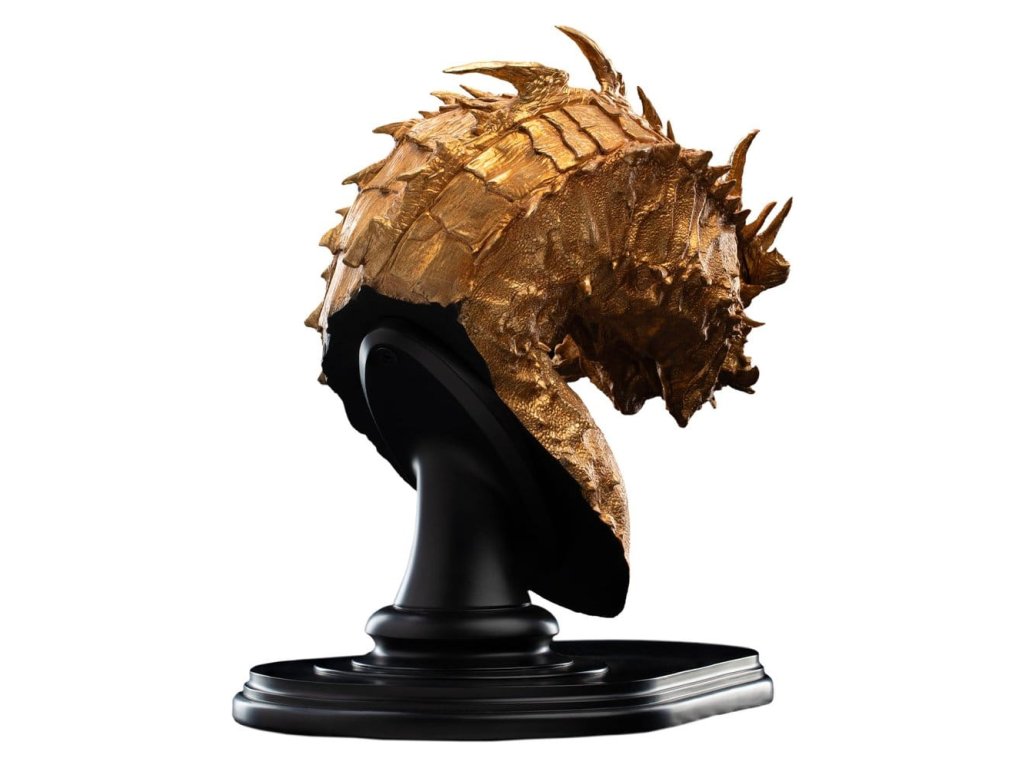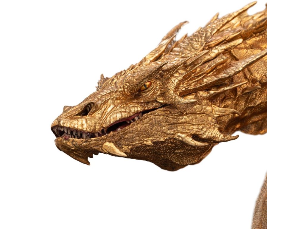 Po staletí spal. Obrovská, šupinatá hmotnost se tlačila na ukradené bohatství Ereboru ™, dýchala zatuchlý vzduch královské hrobky. V temnotě se drak a jeho poklad stali jedním. Už nebyla pouze strážcem zlata, Smaug se stal samotnou podstatou chamtivosti, jeho kůže odrážela třpytivé mince, které toužil nad všechno ostatní.Smaug Zlatý tvoří nápadný 'co když' příběh, představující si Ohnivého Draka spojeného s pokladem, který střeží. K dosažení této lesklé, poklady střežící estetiky naši umělci použili specializovanou techniku metalické folie. Tato složitá aplikace pokrývá šupiny a kůži vrstvou zlata, která simuluje účinek eonů strávených drtěním trpasličích bohatství pod jeho mocí. Přesto, uprostřed této kovové zbroje, oči a tlamy zůstávají rušivě organické; vizcerální připomenutí toho, že pod zlatem stále číhá živý, dýchající monstrum.Omezeno na edici pouze 900 kusů, tento kus si zachovává veškerou složitou texturu originální busty, zatímco nabízí zcela nový estetický vzhled. Busta je navržena pro všestranné využití, může být vystavena stojící na rovné ploše nebo zavěšená na stěně. - Omezená edice pouze 900;- Primárně vyrobeno z polyresinu;- Zobrazuje interpretaci Smauga, jako by poklad Ereboru srostl s jeho kůží;- Aplikace metalické folie vytváří iluzi zlata srostlého s masem;- Perfektně velký, aby se v každé šupině dalo vidět hrozbu a ferocitu zblízka;- 180° otáčení umožňuje jak stojící výstavu, tak uchycení na stěnu;- Sochařil veterán Weta Workshopu Andrew Baker.Rozměry: 46 x 36 x 24 cm