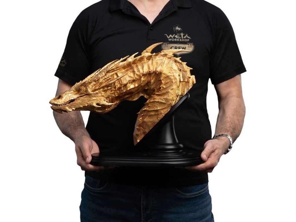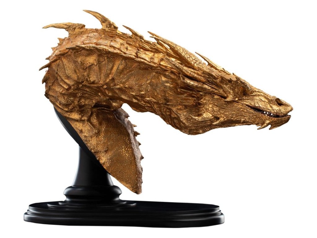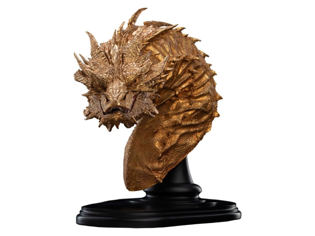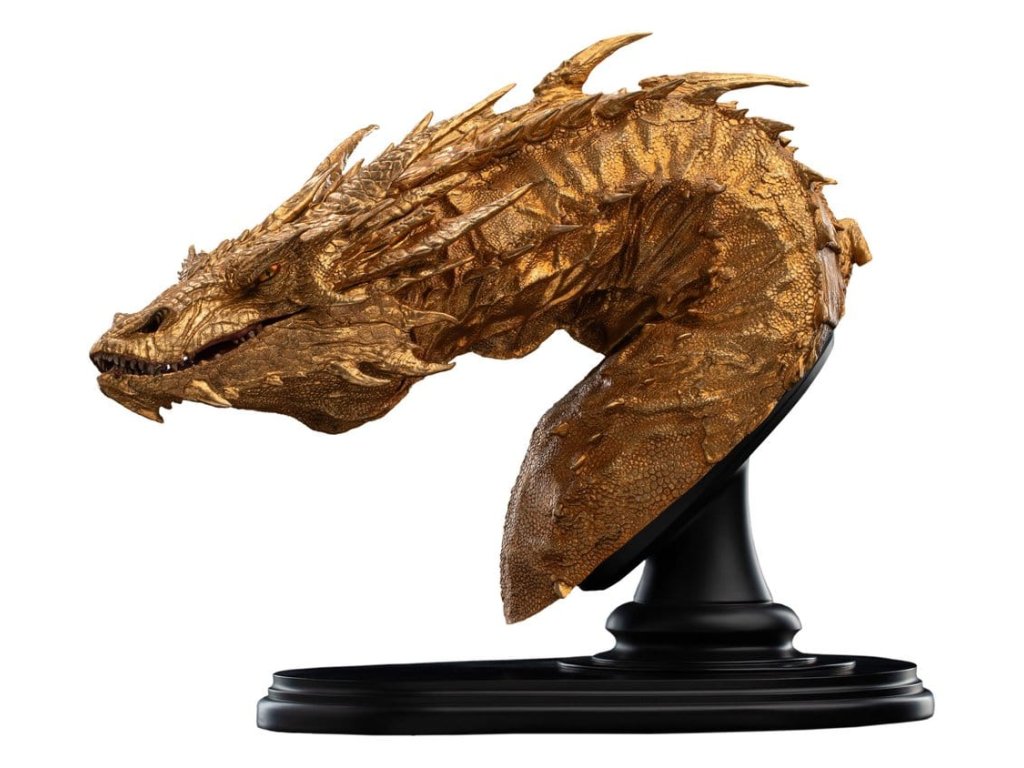 Po staletí spal. Obrovská, šupinatá hmotnost se tlačila na ukradené bohatství Ereboru ™, dýchala zatuchlý vzduch královské hrobky. V temnotě se drak a jeho poklad stali jedním. Už nebyla pouze strážcem zlata, Smaug se stal samotnou podstatou chamtivosti, jeho kůže odrážela třpytivé mince, které toužil nad všechno ostatní.Smaug Zlatý tvoří nápadný 'co když' příběh, představující si Ohnivého Draka spojeného s pokladem, který střeží. K dosažení této lesklé, poklady střežící estetiky naši umělci použili specializovanou techniku metalické folie. Tato složitá aplikace pokrývá šupiny a kůži vrstvou zlata, která simuluje účinek eonů strávených drtěním trpasličích bohatství pod jeho mocí. Přesto, uprostřed této kovové zbroje, oči a tlamy zůstávají rušivě organické; vizcerální připomenutí toho, že pod zlatem stále číhá živý, dýchající monstrum.Omezeno na edici pouze 900 kusů, tento kus si zachovává veškerou složitou texturu originální busty, zatímco nabízí zcela nový estetický vzhled. Busta je navržena pro všestranné využití, může být vystavena stojící na rovné ploše nebo zavěšená na stěně. - Omezená edice pouze 900;- Primárně vyrobeno z polyresinu;- Zobrazuje interpretaci Smauga, jako by poklad Ereboru srostl s jeho kůží;- Aplikace metalické folie vytváří iluzi zlata srostlého s masem;- Perfektně velký, aby se v každé šupině dalo vidět hrozbu a ferocitu zblízka;- 180° otáčení umožňuje jak stojící výstavu, tak uchycení na stěnu;- Sochařil veterán Weta Workshopu Andrew Baker.Rozměry: 46 x 36 x 24 cm