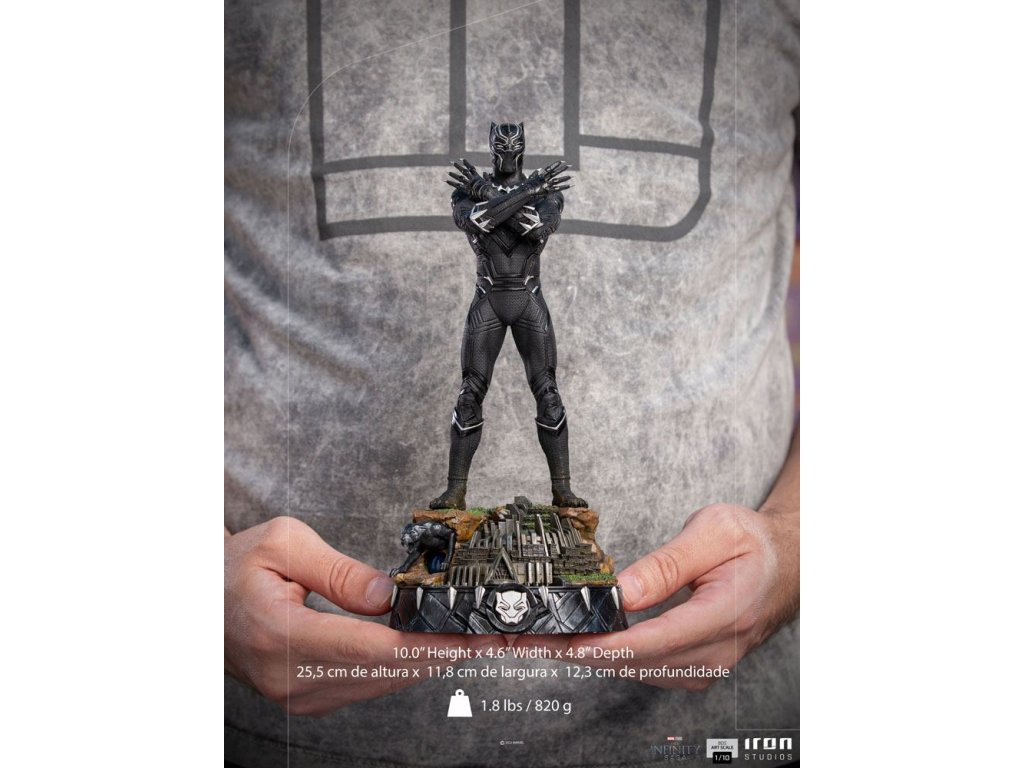 Ve ctění tradic a principů své vlasti, Wakandy, fiktivní země izolované od světa umístěné v Africe, se tento majestátní bojovník celý svůj život připravoval na to, aby obsadil místo svého otce. Se zkříženýma rukama, v symbolickém předkovském gestu, otevírá své ruce, v nichž prosvítají jeho zatahovací stříbrné drápy, čímž prohlašuje nesmrtelnost svého národa. Na detailně propracovaném podstavci, který v miniatuře napodobuje jeho palác, s ikonickou totemovou sochou, symbolem pantera, zdobenou stříbrnými detaily a jeho erbovním emblémem na přední části, Iron Studios s hrdostí představují sochu Black Panthera Deluxe z The Infinity Saga v měřítku 1:10. Roli ztvárnil zesnulý Chadwick Boseman v MCU, poté co byl jeho otec, král T'Chaka, zavražděn, převzal vládu nad svou zemí a stal se spojencem hrdinů Avengers. Nezmeškejte šanci přidat Black Panthera do své sbírky Avengers! Funkce: - Limitovaná edice - Založeno na originálních referencích - Vyrobeno z polystone *(může obsahovat části z pryskyřice, polystone, PVC, kovu a tkaniny) - Ručně malováno - Základna má LED diody Velikost: 25,5 x 11,8 x 12,3 cm