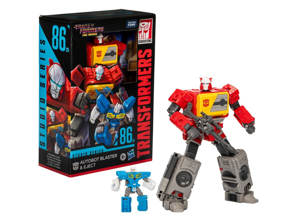 Neuvěřitelně detailní 16 cm vysoká sběratelská akční figurka Autobot Blaster & Eject z řady Generations Studio Series Voyager Class inspirovaná filmem The Transformers: The Movie od společnosti Hasbro.